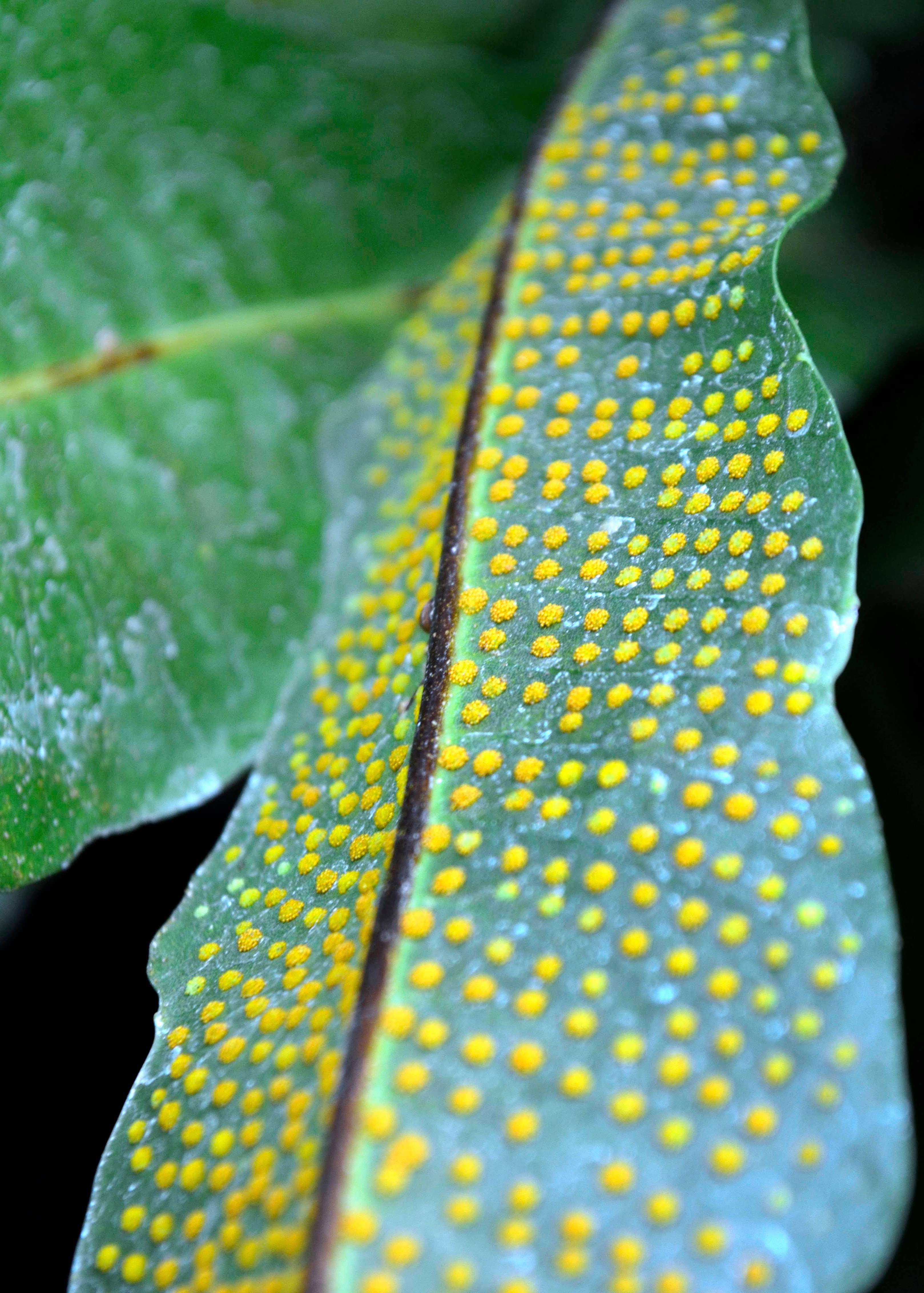 I like ferns. Whenever I am at a botanic garden, I take a close look at them. I love the elegance of the leaves (fronds), the way the fronds unfurl, and the polka-dot patterns of the sori (spore cases) on the underside of the fronds.