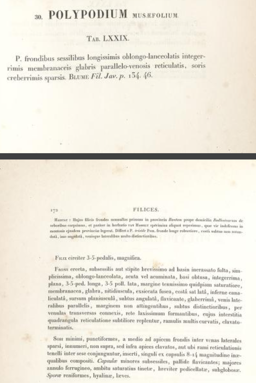 Motivated by this discovery, I kept looking and — amazingly — found a full-text 1858 version of Flora Javae, thanks to the Biodiversity Heritage Library; it is from an edition held by the Peter H. Raven Library at the Missouri Botanical Garden. The 1858 version includes all the sections added previously, including the one on ferns. I searched the text for ‘Microsorum musifolium,’ but no luck. Then I remembered Blume’s lithograph was labeled ‘Polypodium.’ That worked; there are a LOT of Polypodium entries in Flora Javae. But the search did not turn up any entries for Polypodium musifolium or musaefolium (at the time, I did not realize that this result – POLYPODIUM MUSffiF0LIU3L — was the one I was looking for). So I tried to scroll through all the entries manually to find it . No luck, again. Until I came across another clue: the lithograph was described online as being Tab. LXXIX, and using that as a guide, I finally found the entry for ‘Polypodium Musaefolium’ on pp. 171-72 of Flora Javae: