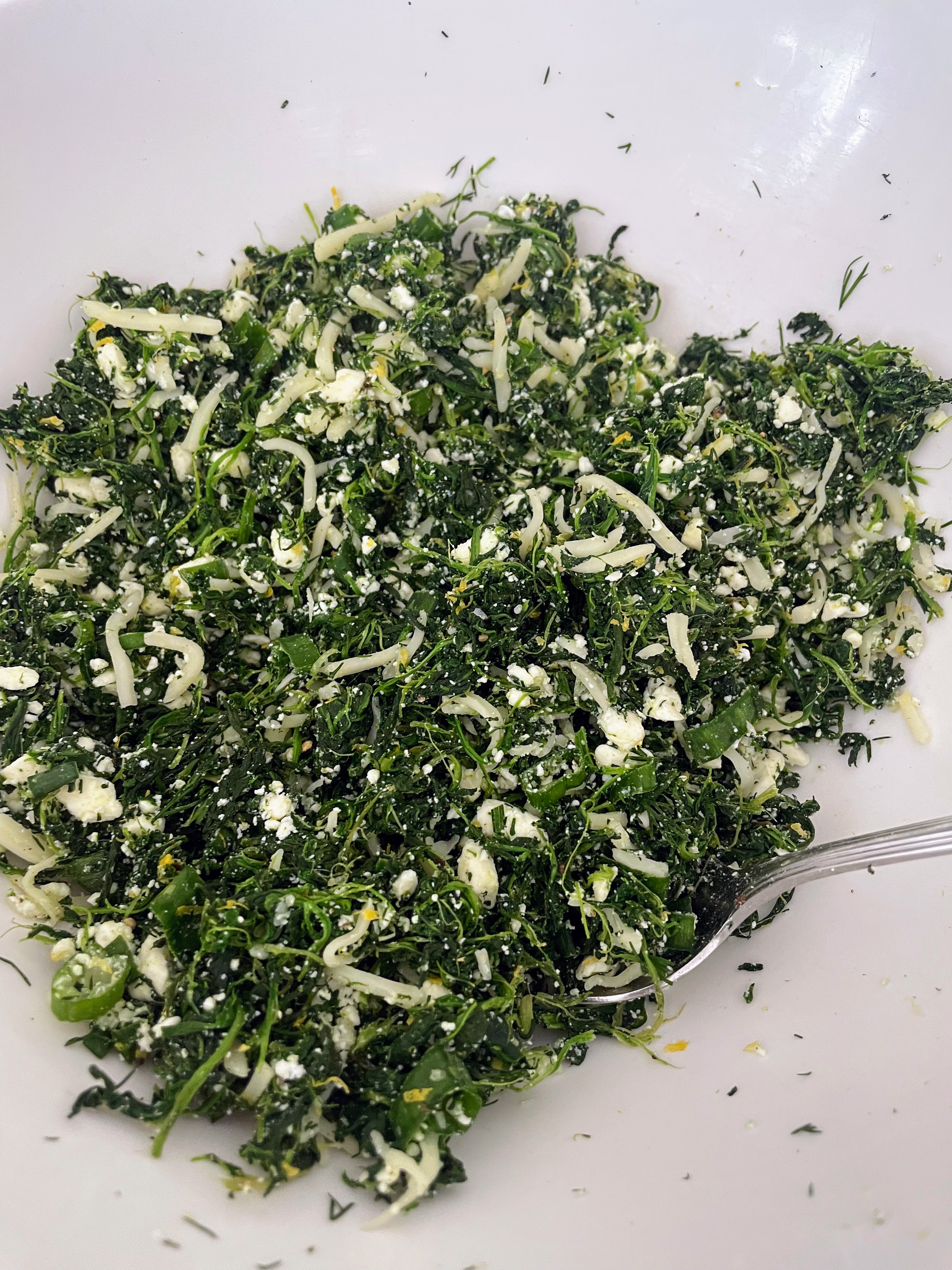 3. Add the spinach, scallions, dill, feta, garlic, lemon zest, salt, and pepper to a medium bowl. Stir to combine, making sure to break up any spinach clumps. I find it is easiest to use my (clean) hands to do this. You should have 2½ cups spinach mixture. (The photo below is from when I added mozzarella to make up for not having quite enough spinach.)