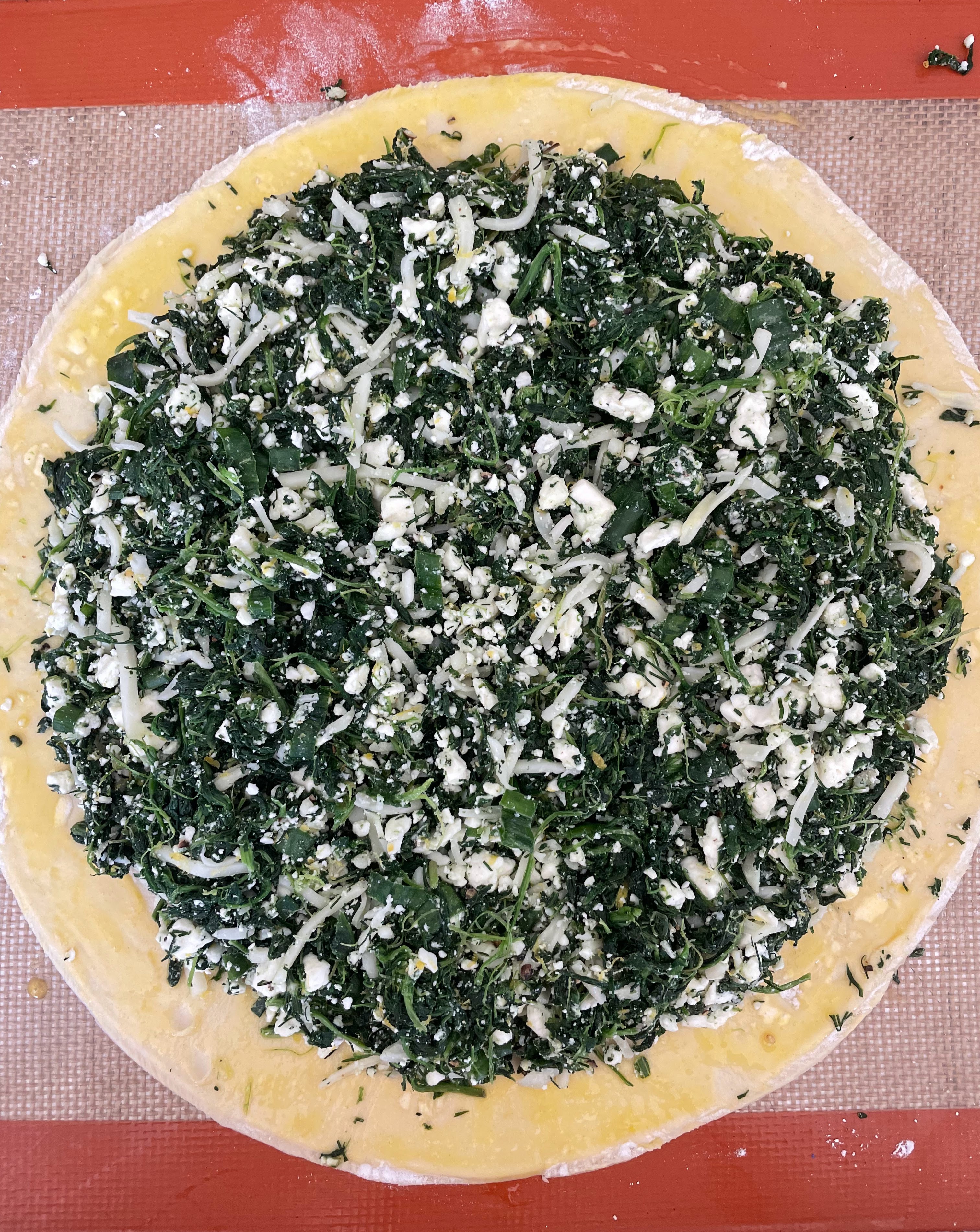 7. If you rolled your pastry directly on the counter, now is the time to 1) transfer your pastry round to some parchment paper (preferred) or to a baking mat (if you are out of parchment), and then to 2) place the whole thing on a baking sheet. Brush the egg wash all along the circumference of the pastry round; reserve remaining egg wash for later. Spread the spinach mixture over the pastry base, leaving a ½” border.