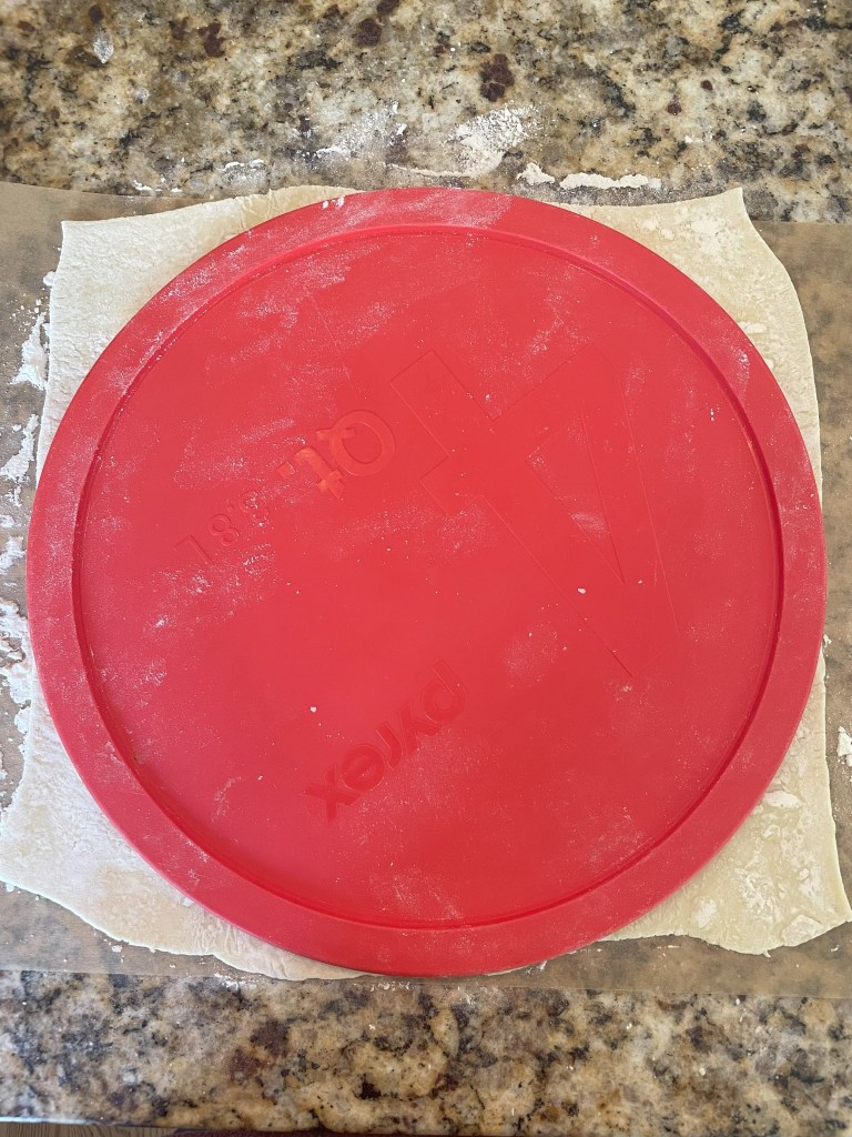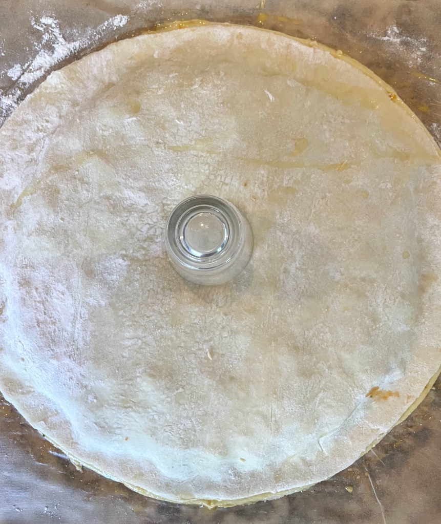 6. Place the round object/lid over the pastry, press to indent, then use a sharp knife to trace the circle. Set aside the excess pastry. (Tip: You can save the excess pastry in the fridge for a couple days, tightly wrapped, then when the urge strikes you can tear it into small pieces, dust with cinnamon and sugar, and bake for a few minutes for a quick and delicious treat).
