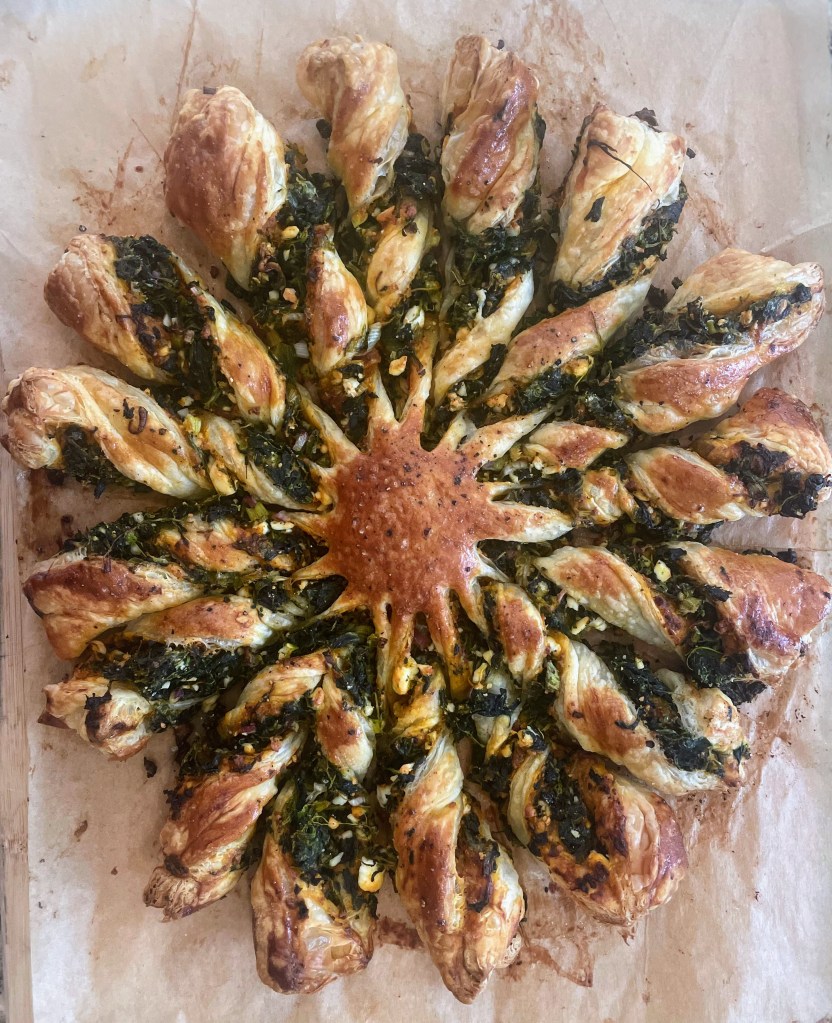 10. Working with one spoke at a time, pull gently away from the center (to extend the length of each piece), then twist to expose the spinach insides. Aim for three or four twists. Nudge them around to distribute evenly. it doesn’t matter if they look messy; they will all look beautiful when baked. Freeze the tarte until cold, 10–15 minutes.