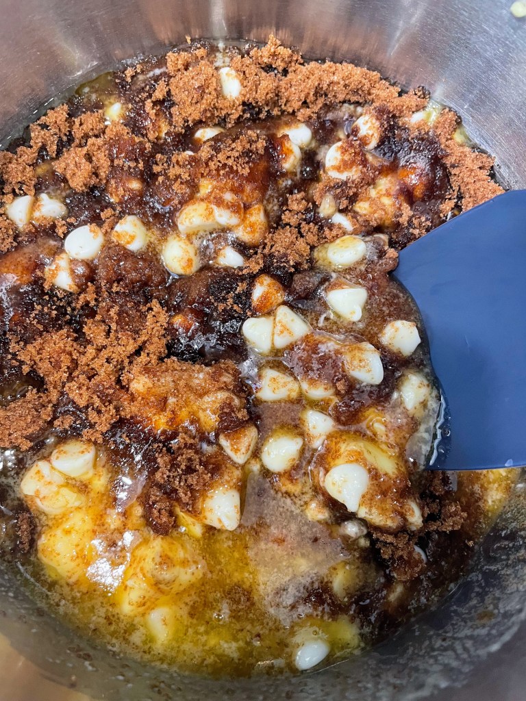 3. Add eggs to white chocolate mixture in saucepan, one at a time, beating well after each addition. Sift in the flours (plus the extra ingredients if you don’t have self-raising flour) and stir until well combined.