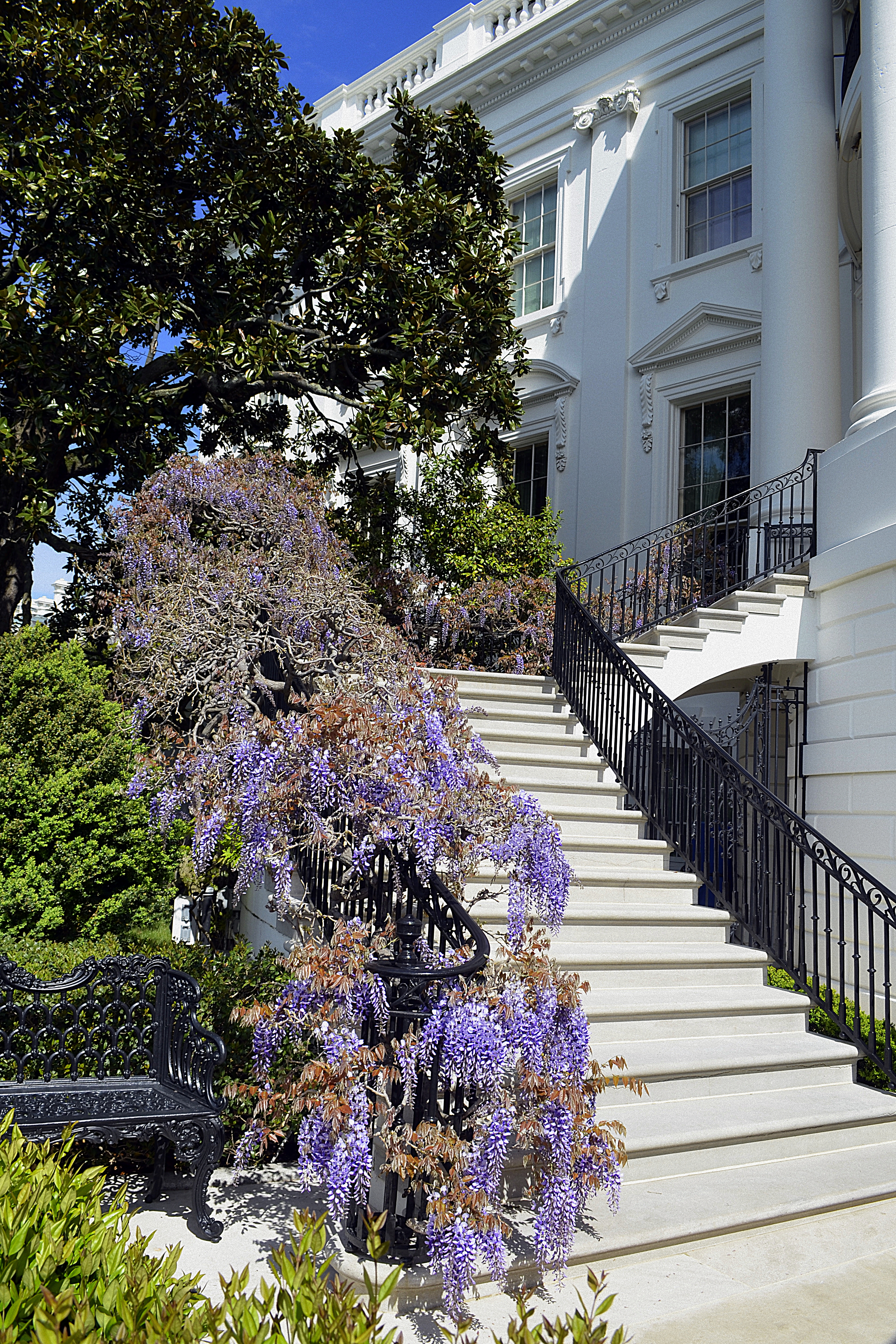 Aside from tulips , there are commemorative trees throughout the gardens, planted by various presidents and first ladies. The oldest are two huge Southern Magnolias that have been flanking the South Portico of the White House since 1830, when Andrew Jackson planted them (see glimpses of both trees, plus some wisteria, below):
