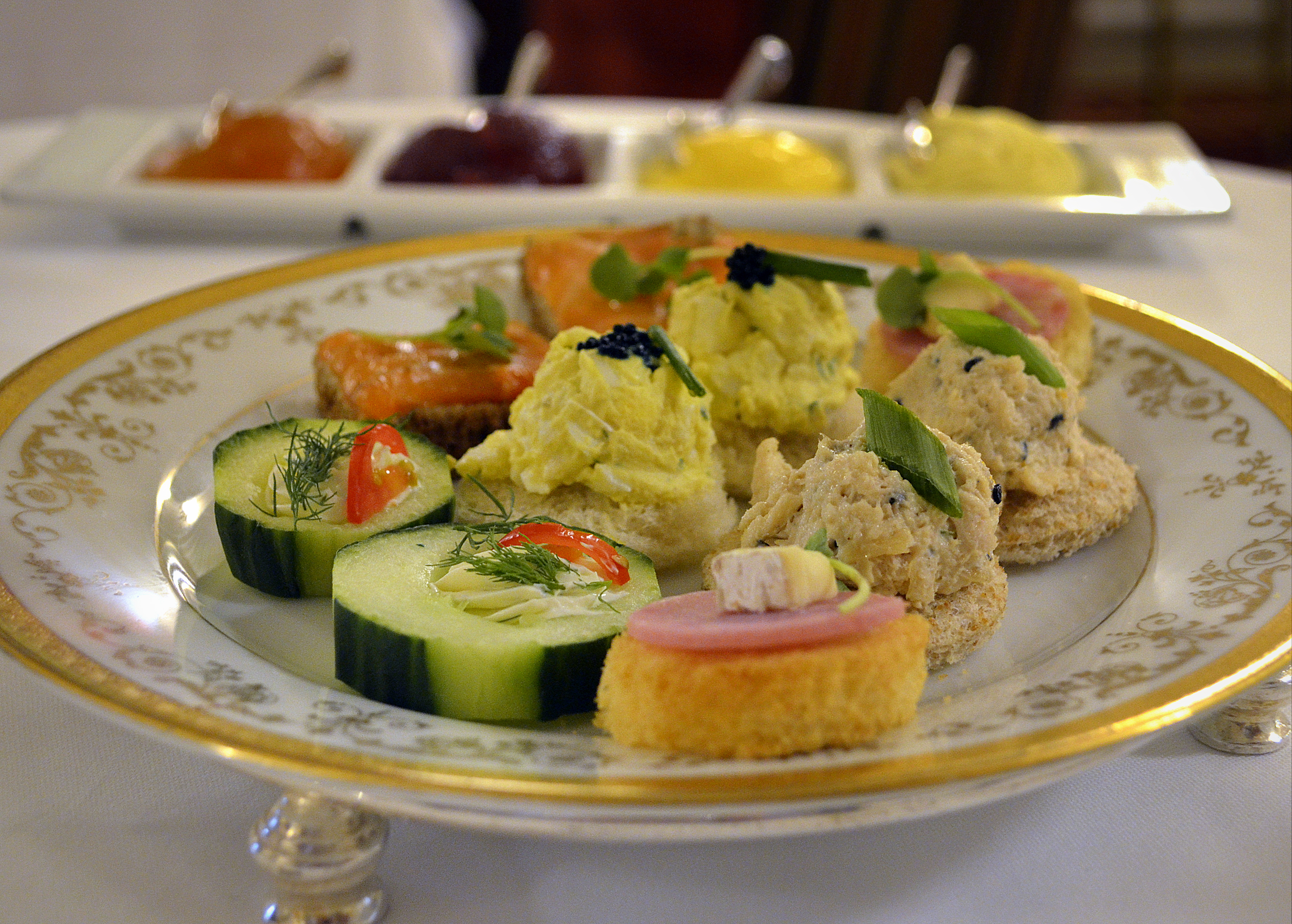 And here is the sandwich part of our tea–a very small part of the overall meal, which also included two kinds of scones, four types of pastries, and chocolate mousse. And a pot of tea.