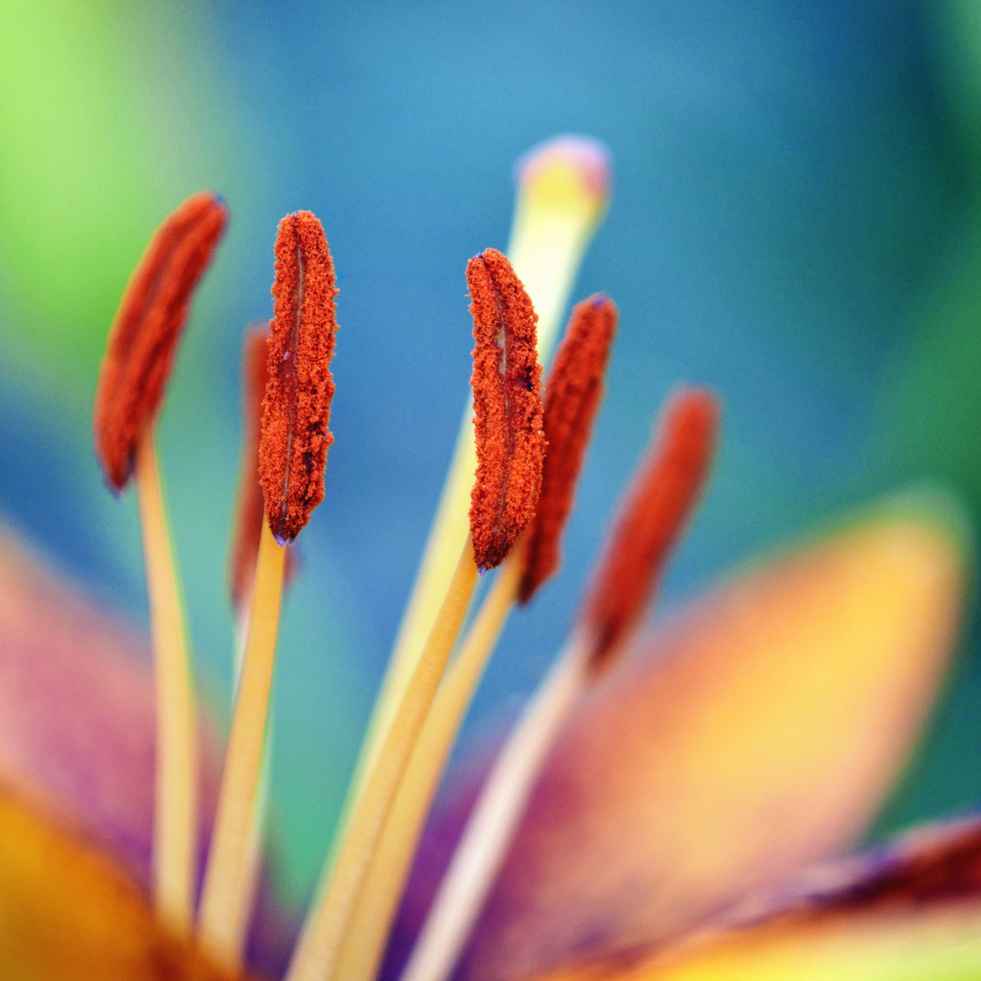 Here is a better view of the pistil and its three-lobed stigma, surrounded by the six stamens. This photo is from a different lily, but luckily the pollen here is also orange, fitting in with this week’s theme.