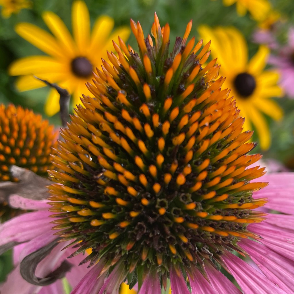 3. Look at the “petals” (though technically, they are ray florets, not petals): This can often help, but not always. According to this way of telling the difference between the two plants, echinacea petals tend to droop and point downward while rudbeckia petals tend to stick straight out. But in the photo below, some of the echinacea petals are drooping and some are sticking straight out. It depends on the variety and the plant’s stage of development. So use the “petal” test as a first form of evidence gathering if you like, but be sure to confirm with the cone test; it will give you the right answer.