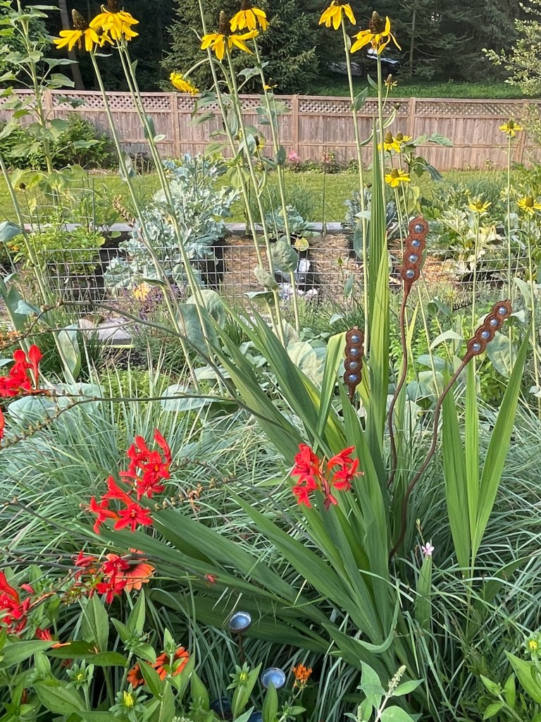 I suspect some difficult interpersonal dynamics led to the last few lines, so I won’t dwell on those. But I quite like the first two lines. They summarize my feelings about a beautiful flower in my garden, which I love when it’s in the right place and frown over when it pops up (again and again) in the wrong place(s): Crocosmia.