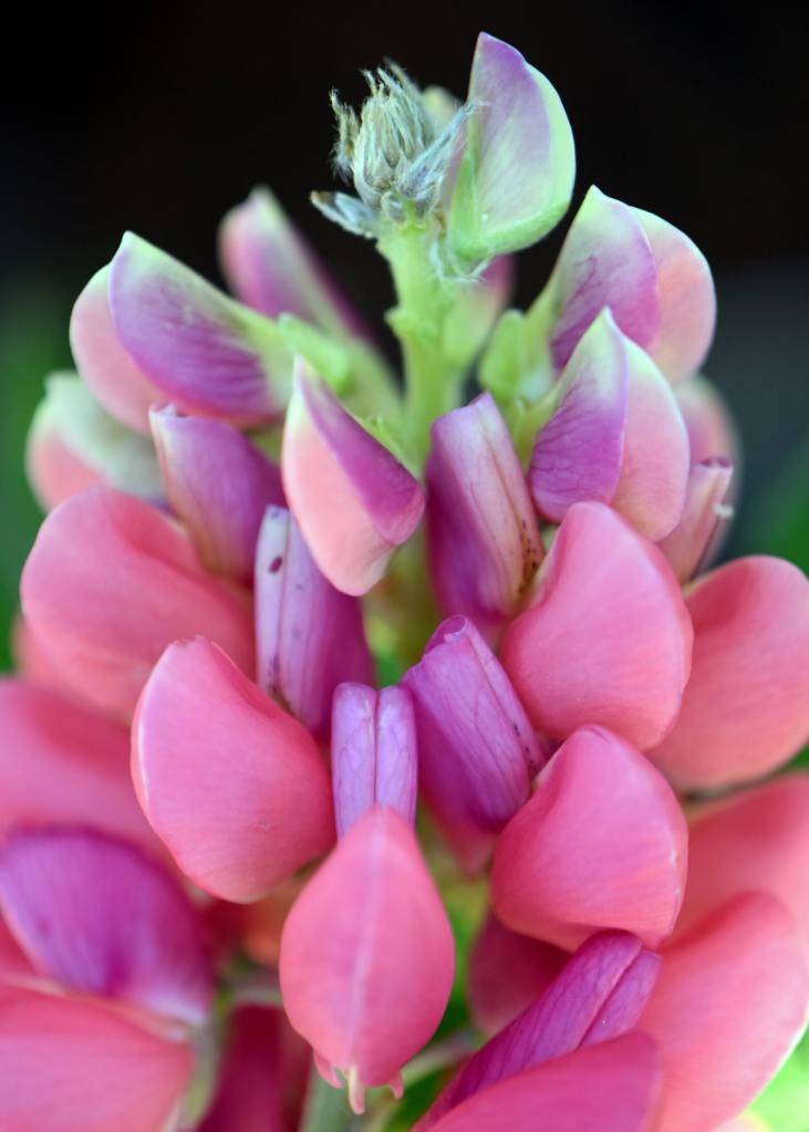 With their lighter-colored center markings, the banners act as sign posts to attract pollinators, ie, bees. (Though most lupines can self pollinate, bees can also help). The two wings form the distinct pea-flower shape and surround the keel, making it hard to see; in the middle photo above, I peeled away one of the wings. The keel protects the flower’s reproductive parts, which are tucked inside it. When a bee lands on the wings, they open up like a clam and expose the keel, which also opens slightly. The bee pollinates the flower by knocking the stigma and anthers together, and in the process collects pollen to feed to its young. The banner then does a really cool thing: it changes color after pollination, to let the bees know there is no more pollen to be had at that particular flower.