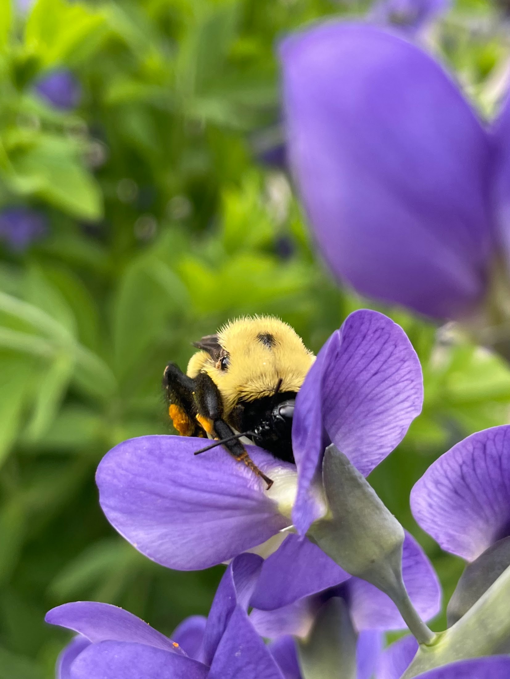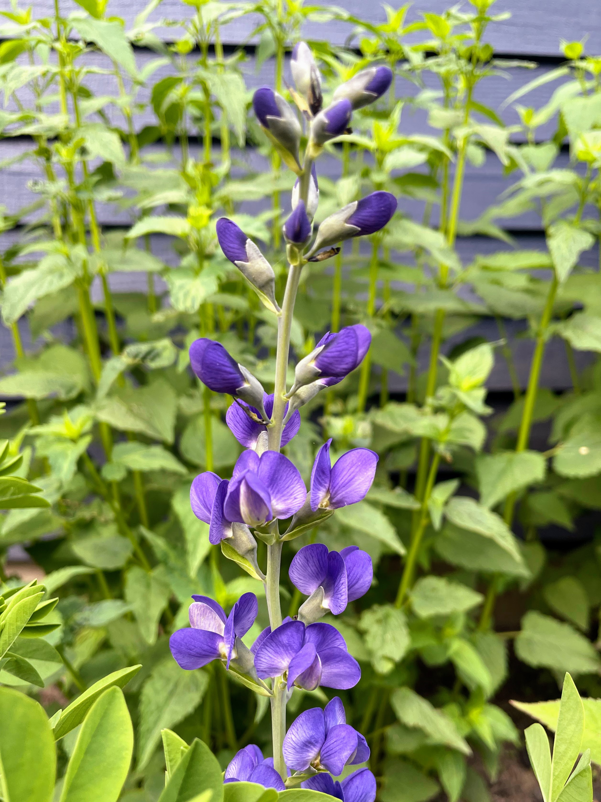 *For flower-comparison sake, here are two photos of Baptisia australis, which also belongs to the Pea family and has banners, wings, and keels. In the last photo, a bee has found its way to the pollen thanks to the banner markings.