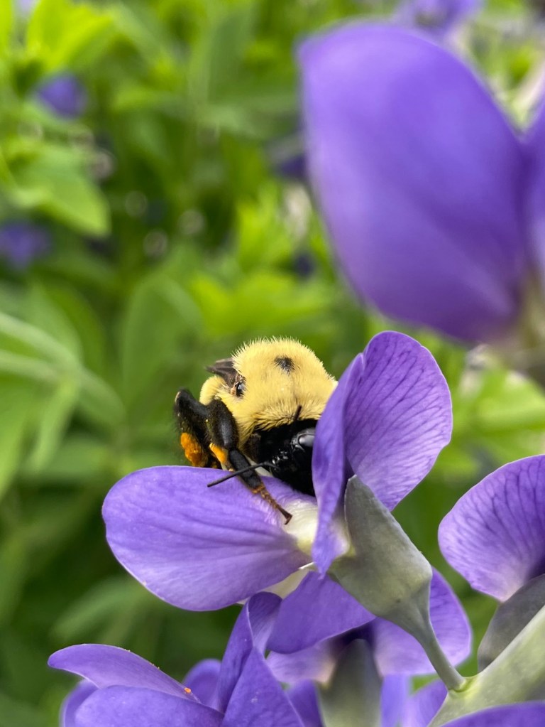 (l-r): Baptisia flowers, with banners, wings, and keels underneath; Bee looking for pollen
