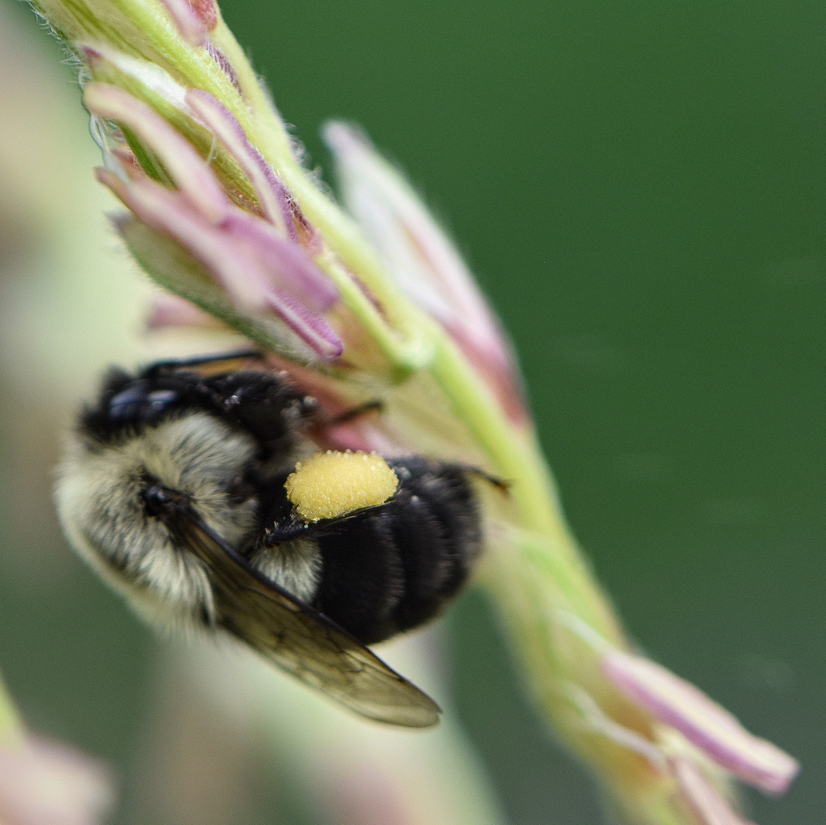 Though corn is pollinated by the wind (anemophily), pollination can also occur with the help of insects (entomophily). Luckily for me, as I was taking photos of the tassels, a bumble bee appeared. Or, more specifically, a female bumble bee appeared–as the females are the only ones to have pollen baskets (corbiculae) on their hind legs.