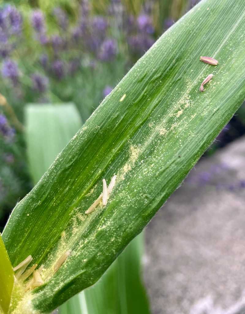 I don’t have any photos of pollen on the silks, but this is what the tiny yellow pollen grains look like on a corn leaf, along with some spent anthers (they drop off the tassel after the pollen is shed).