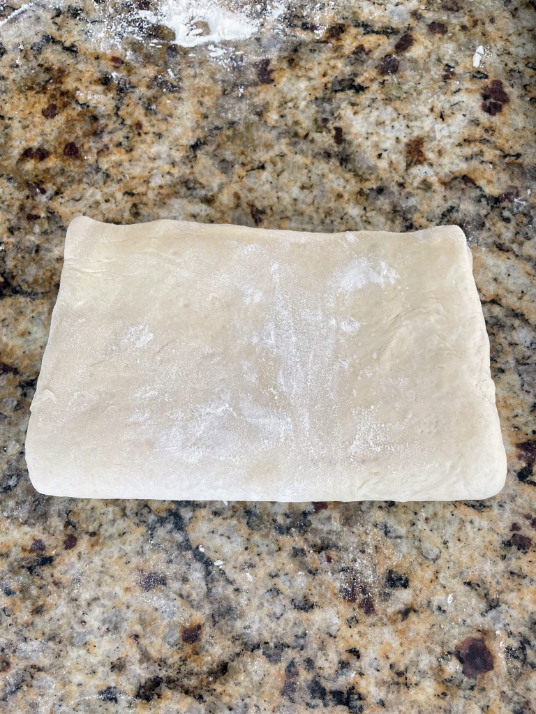 –Turn #2: Place the unwrapped packet of dough on a floured surface with the open, narrower edge facing you. Roll the dough out to a rectangle 12 in. wide x 20 in. long (30 x 50 cm.). Fold the top third down and bottom third up, again like folding a letter. Place the packet of dough on a baking sheet, cover with plastic wrap, and refrigerate for 30 minutes.
