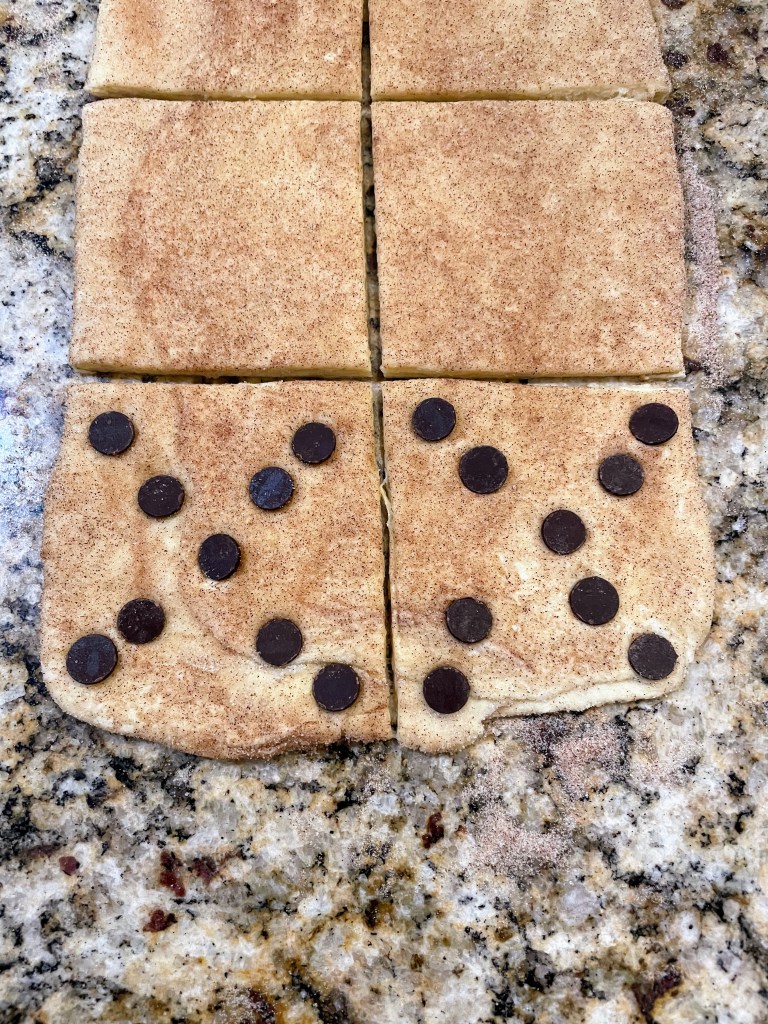 Remove the dough from the refrigerator and transfer it to the counter. Sprinkle a little extra sugar (and cinnamon, if desired) over the top of the dough; pat to press it in. Roll the dough out to a rectangle 8 in. wide by 24 in. long (20 x 60 cm.) [If making half a batch, roll the dough out to 8 x 12 in. (20 x 30 cm.).] Slice the dough down the long side to form two strips that are 4 in. wide. Cut each strip into 4 x 4-in. squares (10 x 10 cm.) to create 12 squares (or 6 squares if making a half batch).
