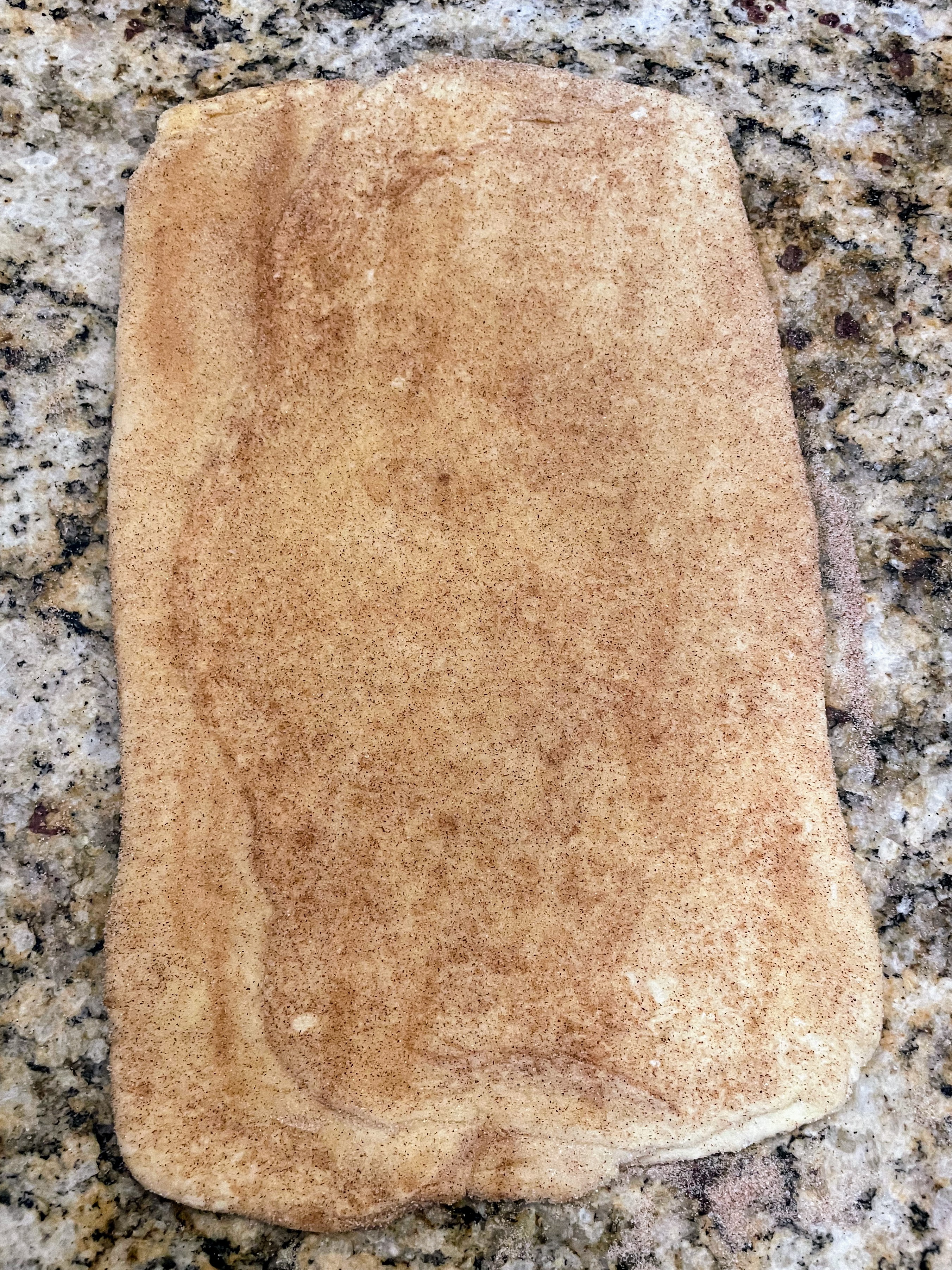 –Turn #3: Place the unwrapped packet of dough on a floured surface with the open, narrower edge facing you. Roll the dough out to a rectangle 12 in. wide x 20 in. long (30 x 50 cm.) [If making half a batch, roll the dough out to 6 x 10 in. (15 x 25 cm.); pinch cut edge closed before rolling]. Sprinkle the entire surface of the dough with 2/3 c. sugar [1/3 c. sugar for half batch], then press lightly to help it stick to the dough. Sprinkle with 1 tsp. cinnamon [1/2 tsp. for half batch], if using. Fold the top third down and bottom third up, again like folding a letter. If any sugar falls out, press it back into the folds. Place the packet of dough on a baking sheet, cover with plastic wrap, and refrigerate for 30 minutes.