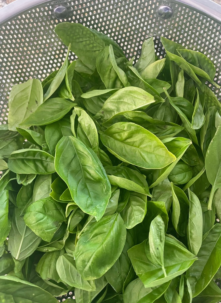 The very last of my basil has flowered, so today I headed out and harvested all the remaining good leaves. It took a while, but the sun was warm on my back, the bees were buzzing gently by, and the smell of the basil as I plucked each leaf one by one, was intoxicating. There are worse ways to spend part of an October morning.