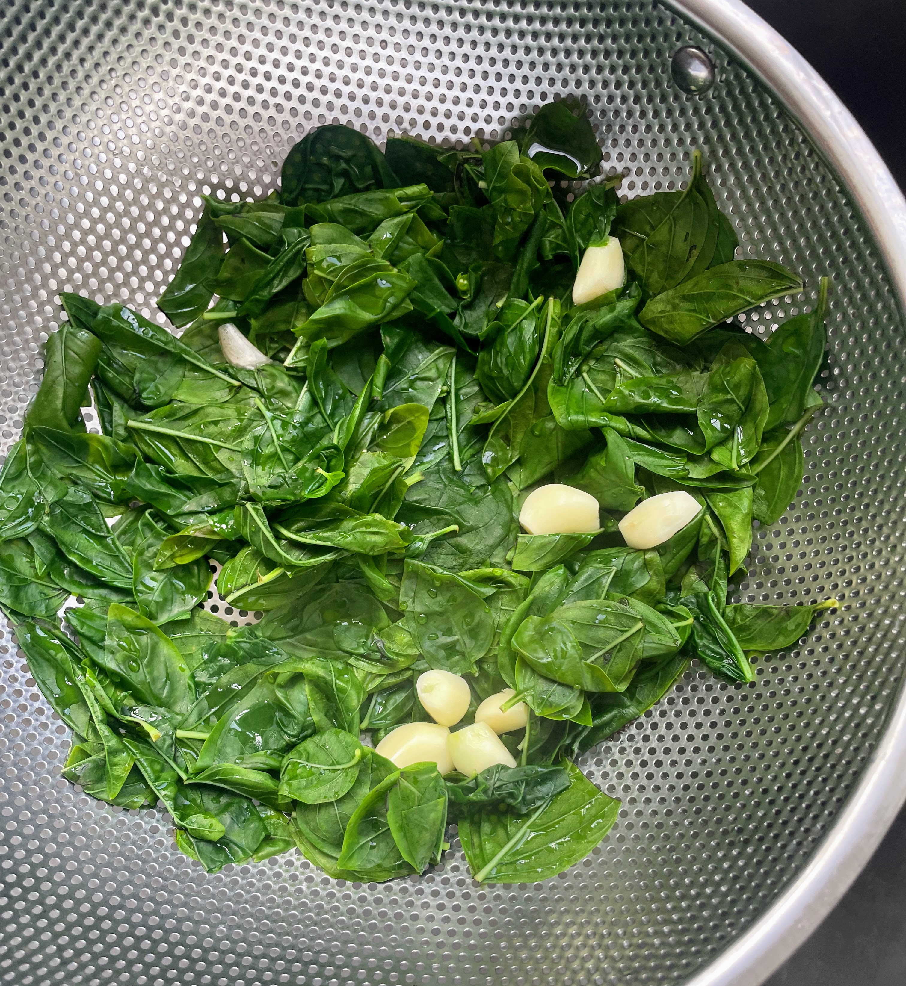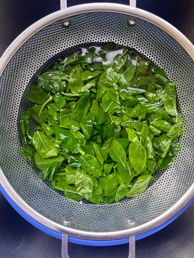 4. Once the spinach is cold, remove the colander from the bowl, set in the sink, and let the basil and garlic drain for a few minutes. Then place the basil and garlic on a clean dish towel and pat as dry as possible.