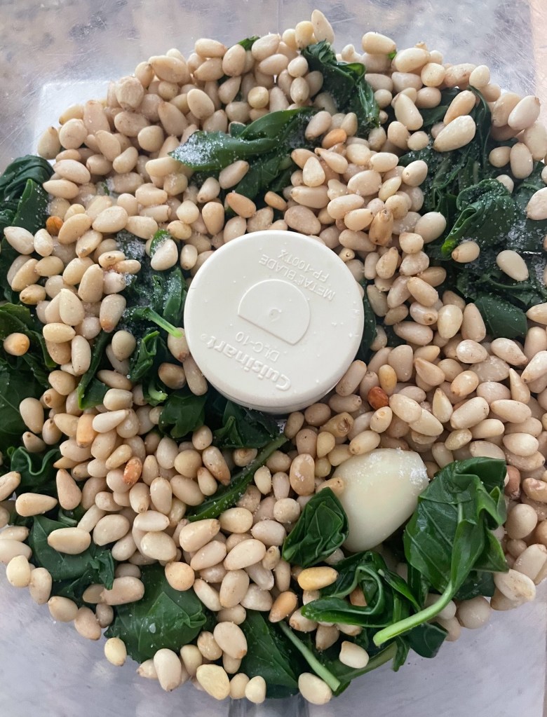 5. Put the basil and garlic in a food processor, add the pine nuts and salt, and pulse until the mixture is finely chopped and begins to come together. With the food processor still running, slowly pour in the olive oil and process until smooth.