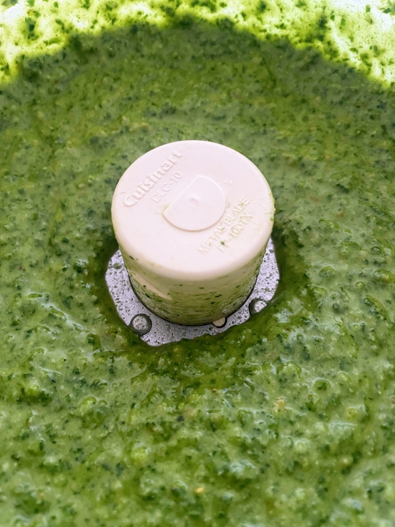 Note: When I am making pesto to freeze, I do not add the cheese or lemon juice. Instead, I add both those things later on to the thawed pesto. So the photos below are pre-cheese, and thus, represent a vegan version that would be delicious on its own, too.