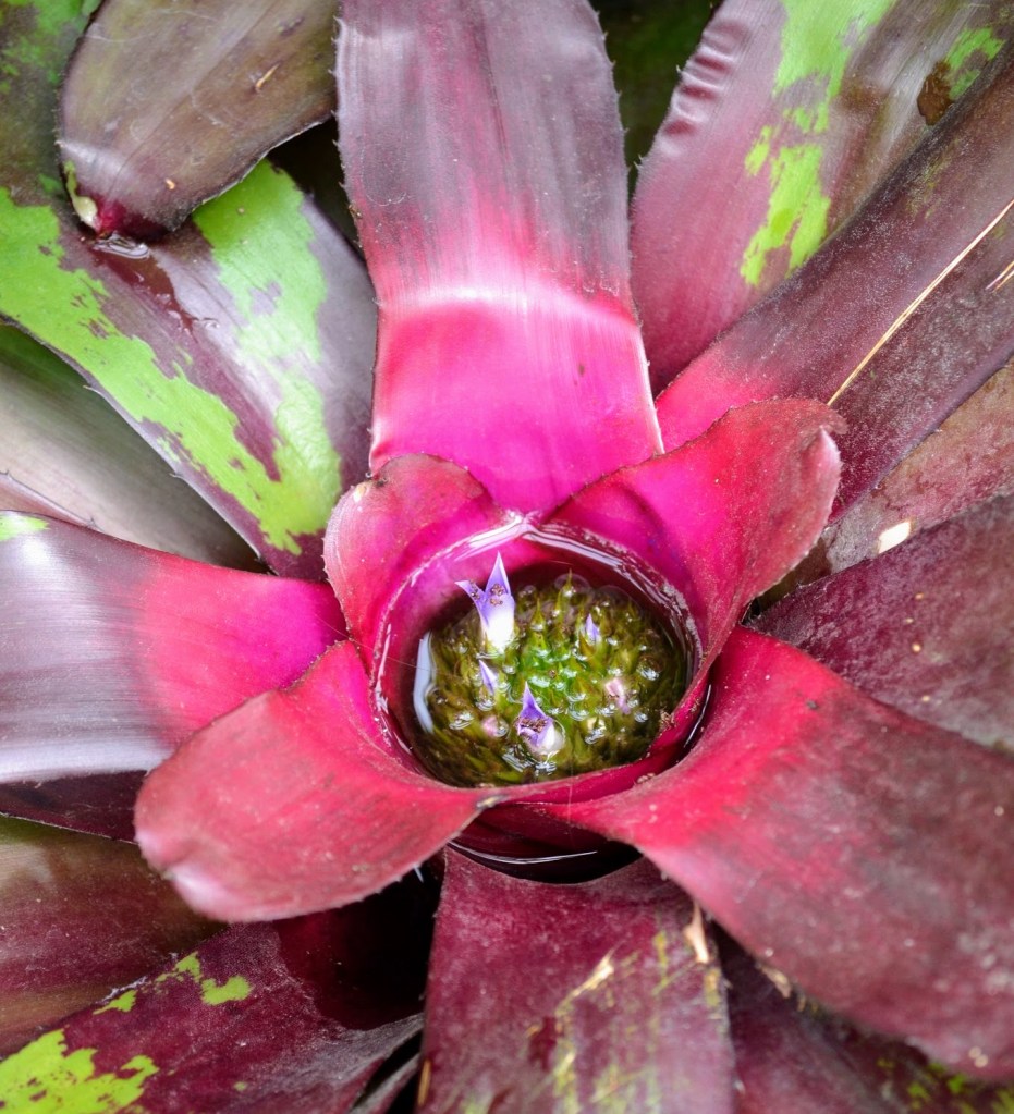 Other plants in the rainforest have the opposite problem; they need to keep water around. Neoregelia Bromeliads like the one below live in the rainforest canopy, where it is harder to capture water than in soggier areas below. They also have to worry about wind taking away any water that may fall on them. So, their long, stiff leaves have adapted to become channels that funnel water to a reservoir in the center of the plant. This reservoir captures the water and protects it against the wind. Some bromeliad bowls can contain up to several liters (3/4 gallon) of water, and can host a wide range of animals such as tree frogs, snails, flatworms, tiny crabs, and salamanders–many of whom spend their entire lives in the bromeliad bowls.