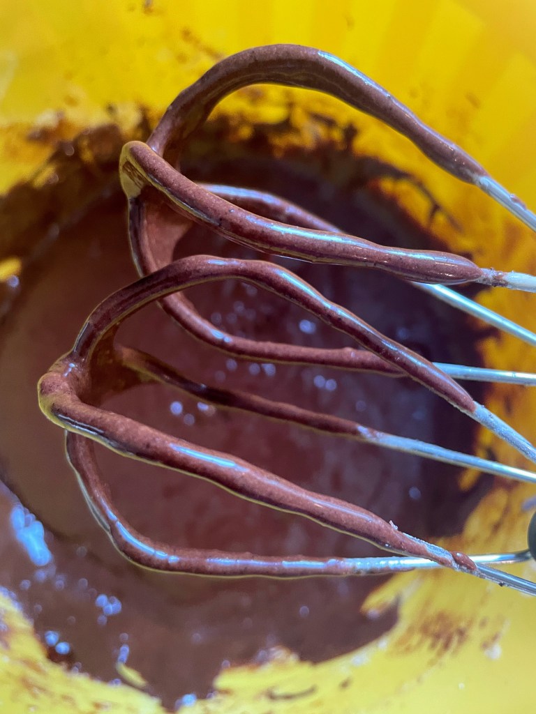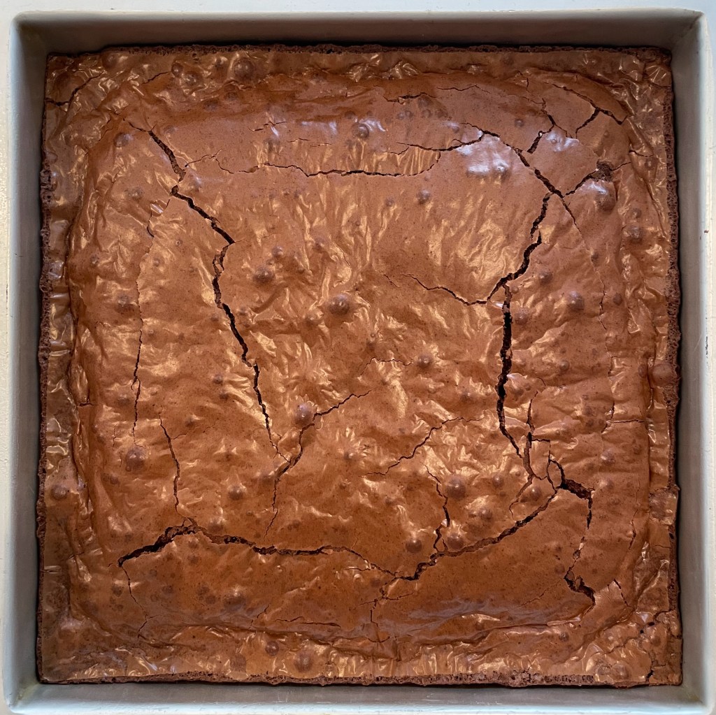 Preparation: 1. Preheat the oven to 160ºC/ 325ºF. Spray a 20×20 cm (8×8 in) square pan with baking spray, line with parchment paper, and spray again with baking spray. 2. In a medium saucepan, add the butter and cook over medium/high heat until it is golden brown; it will take about 8-10 minutes. Pour the browned butter into a medium bowl, scraping out all the brown bits from the saucepan. Add the cocoa powder and whisk in. Add the chocolate chips, let sit for a few minutes, then stir until melted.