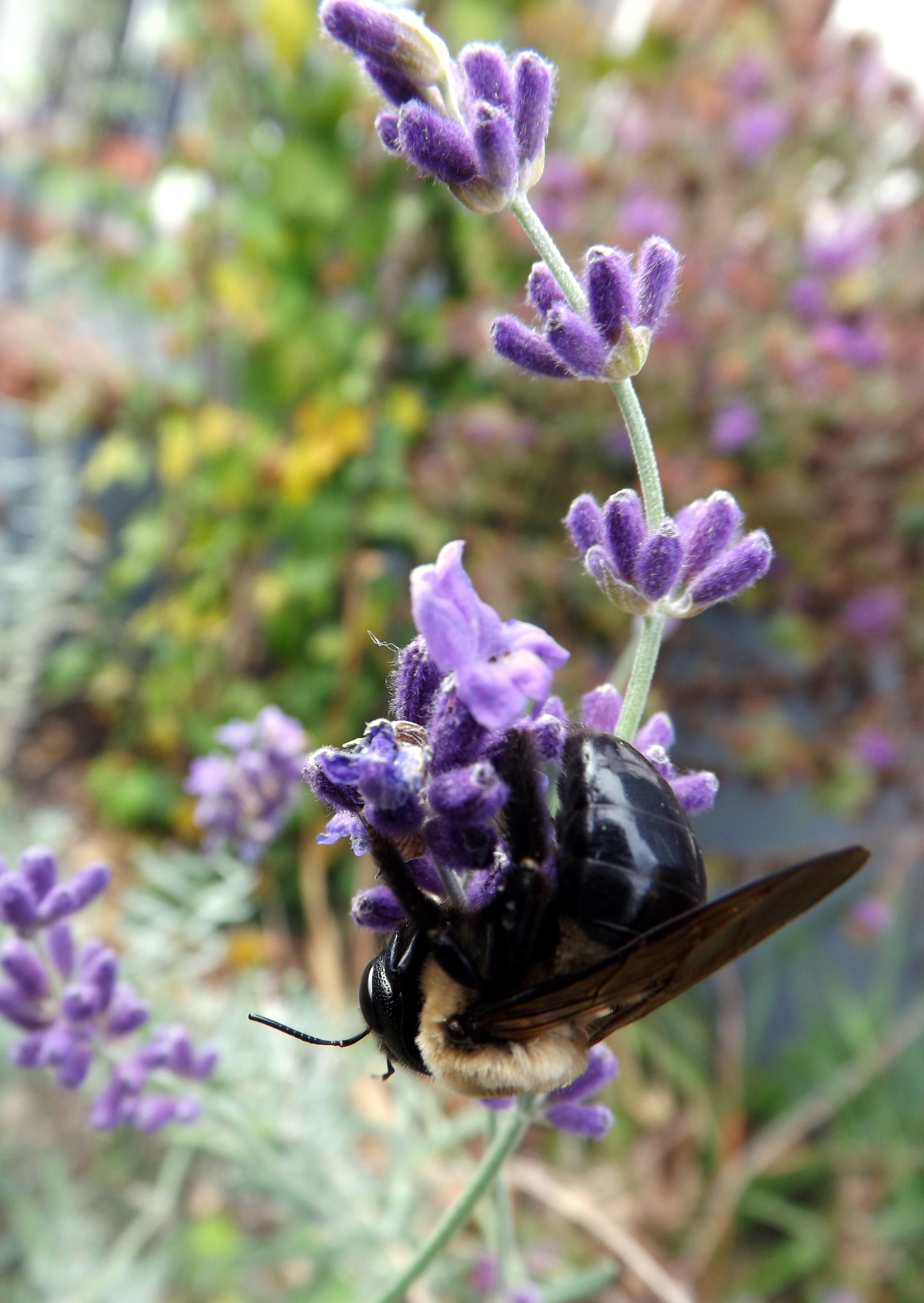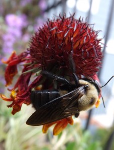 Once a male bumblebee leaves the colony, it doesn’t usually go back. It must feed itself and find somewhere to sleep–either in or on a flower. My garden doesn’t have too many big flowers left to crawl into, so the bees latch on to the smaller flowers (in the photos above: gaillardia, lavender, basil, and hyssop) and let gravity do its work. Because the body temperature of a bee matches its surroundings when it is at rest, it quickly becomes immobile in colder weather and has to wait for more sun to warm up again. It can also re-energize by drinking more nectar, but that is somewhat difficult to do when comatose. Luckily, bees warm up fairly quickly. That is a good thing since a male bumblebee’s #1 job is reproduction, and the chase requires lots of energy.
