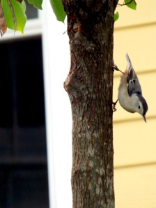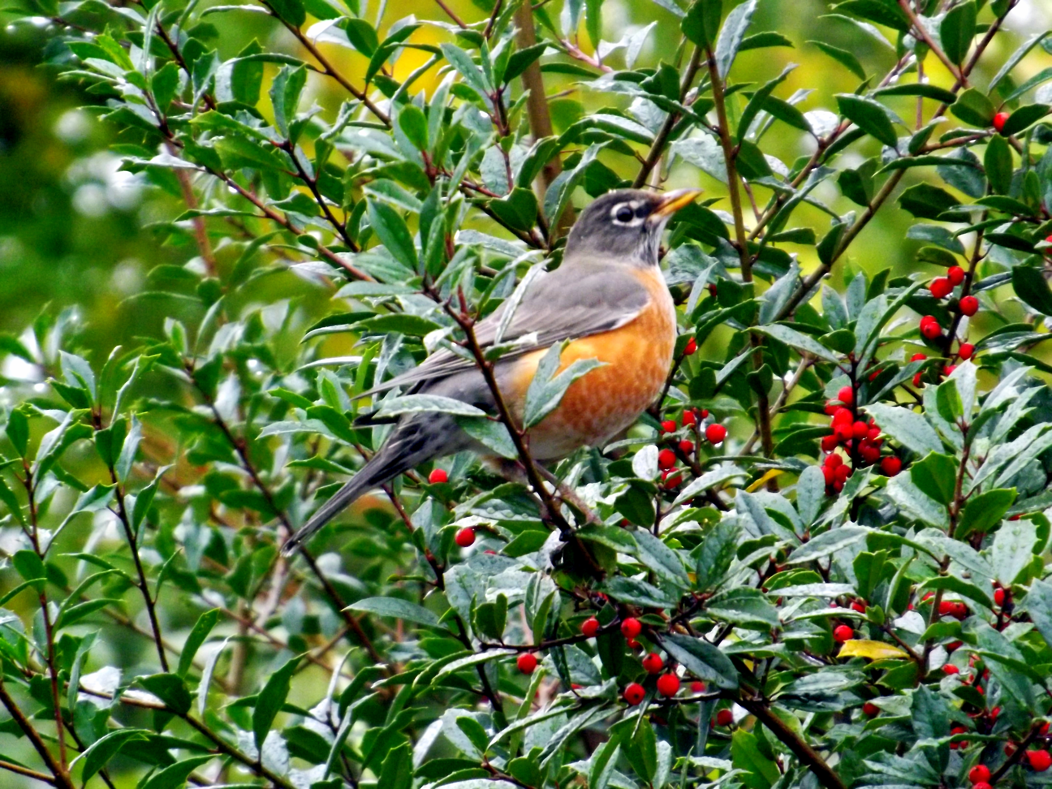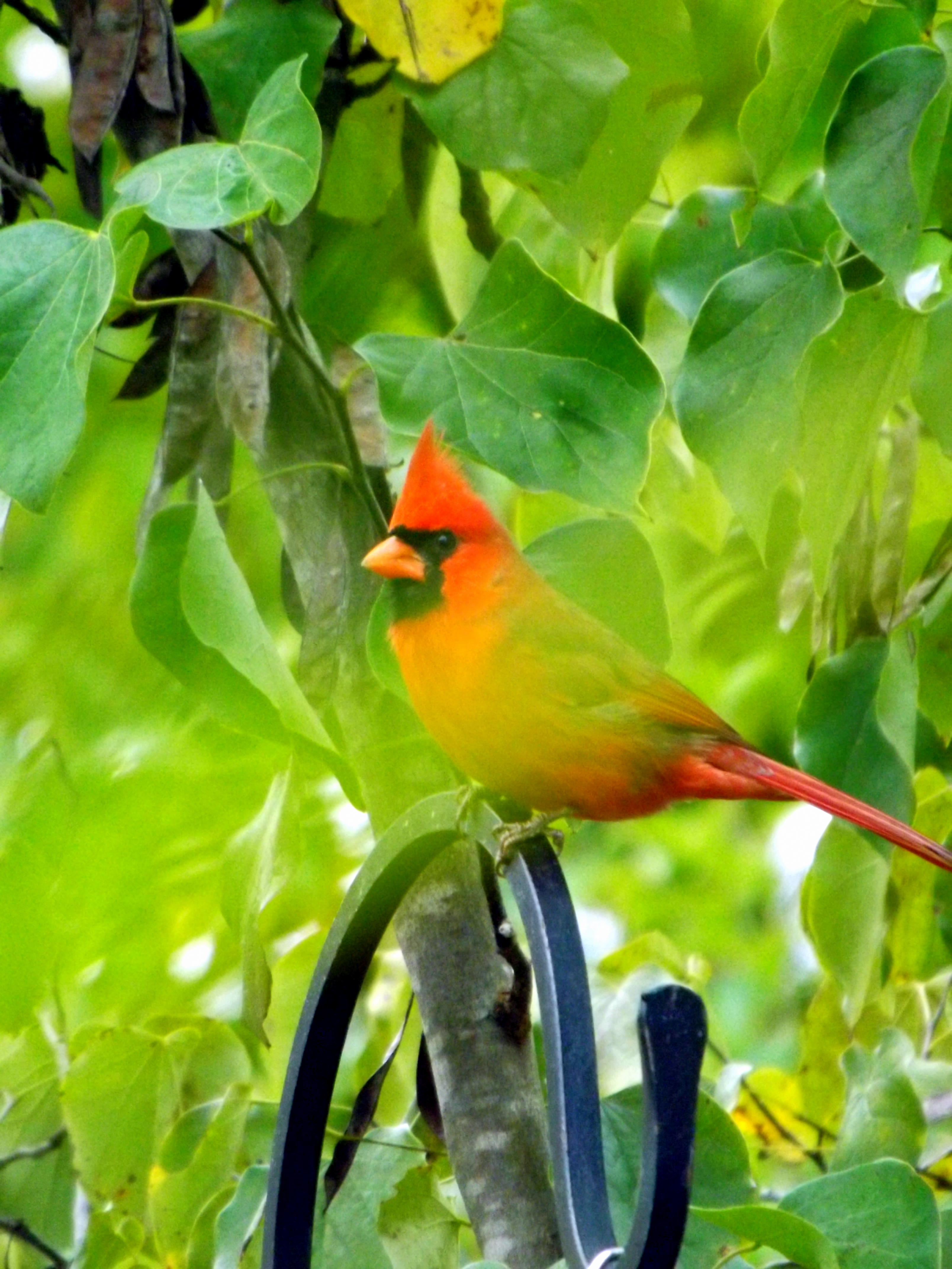This photo was taken at the end of May. Its tubular yellow flowers are quite pretty and though they are slightly fragrant, they don’t have that full honeysuckle aroma. What sets “Kintzley’s Ghost” apart, though, are the circular bracts surrounding those flowers. Bracts are modified leaves; in this case, the circular bracts are different from the plant’s other, more usual-looking leaves. Since bracts often help play a reproductive role, perhaps these round bracts serve as a sort of bullseye, drawing pollinators’ attention to the center of the circles, where the flowers are, and later, drawing birds’ attention to where the berries have developed. Butterflies and hummingbirds are among the “Kintzley’s Ghost” many admirers, as are humans.