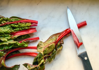 1. Trim the stalks by cutting them off the root end of the bunch of chard. Most stalks should be thin and tender. With larger stalks, take a knife and carefully remove the stringy part by peeling down the center of the stalk.