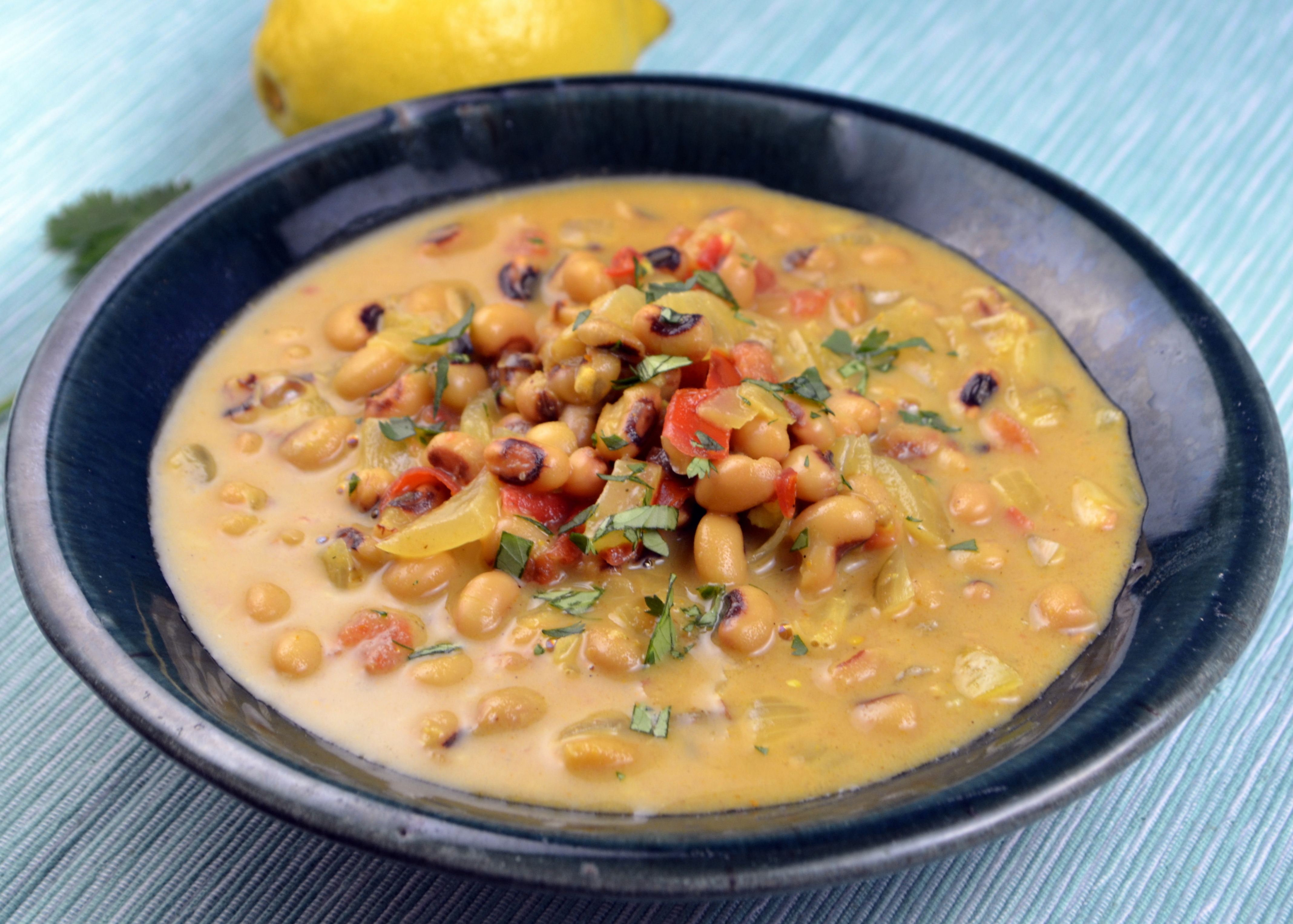Part of the Indian meal I prepared recently for friends with divergent dietary preferences included this Black-Eyed Pea Curry. It answered a number of needs: it is vegetarian (vegan, actually) and is an excellent source of protein. And it goes nicely with drier, less saucy dishes such as the Spicy Indian Eggplant with Tomatoes. Not that dry dishes can’t be saucy in their own ways–that eggplant was quite a palate teaser. This dish, with mellow coconut milk, is a nice counterpoint.
