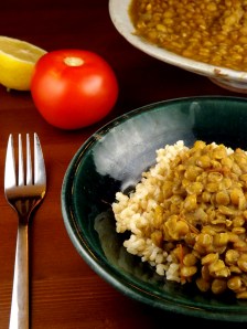 Chickpeas, or garbanzo beans, are the basis for many delicious things, from hummus to brownie bites — all made much more easily (and quickly) by using canned chickpeas. This recipe, adapted from Madhur’s Jaffrey’s Indian Cooking, is one of our favorites–a light curry sprinkled with onions marinated in lemon juice and ginger (hence the lovely “sour” element).