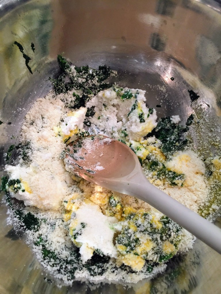 1. Preheat the oven to 400F (200C). 2. Rinse the spinach well and cook in a pot with only the water that is clinging to it, until soft and wilted. Remove, drain/squeeze dry, then chop. Put the spinach in a bowl with the garlic and a drizzle of olive oil; toss to combine.