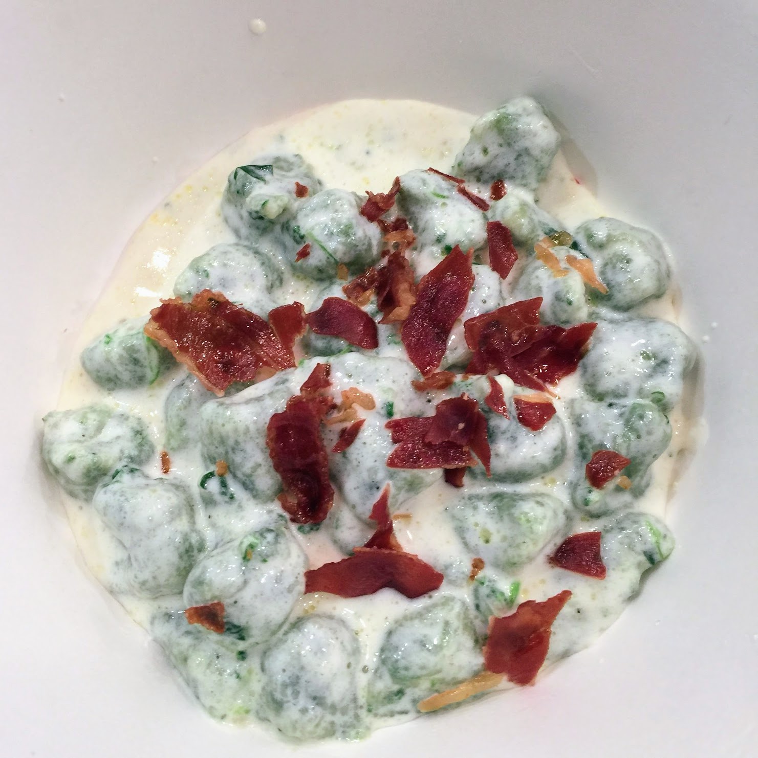8. Remove the gnudi with the skimmer, spider, or slotted spoon and place them in a serving bowl (or another pot); pour the cream sauce over, adding more grated cheese if desired. Serve in individual bowls with crispy prosciutto on top. Enjoy!