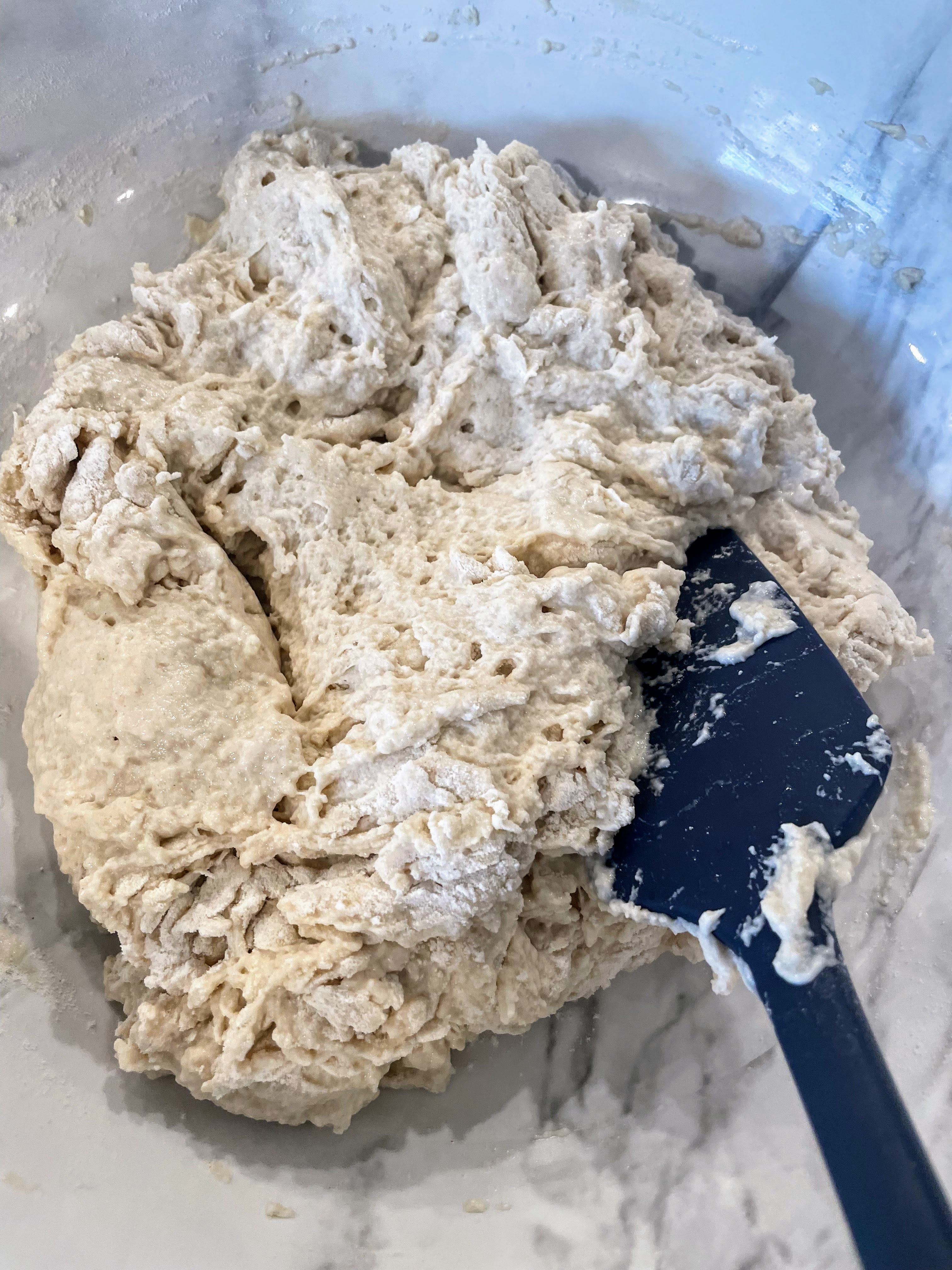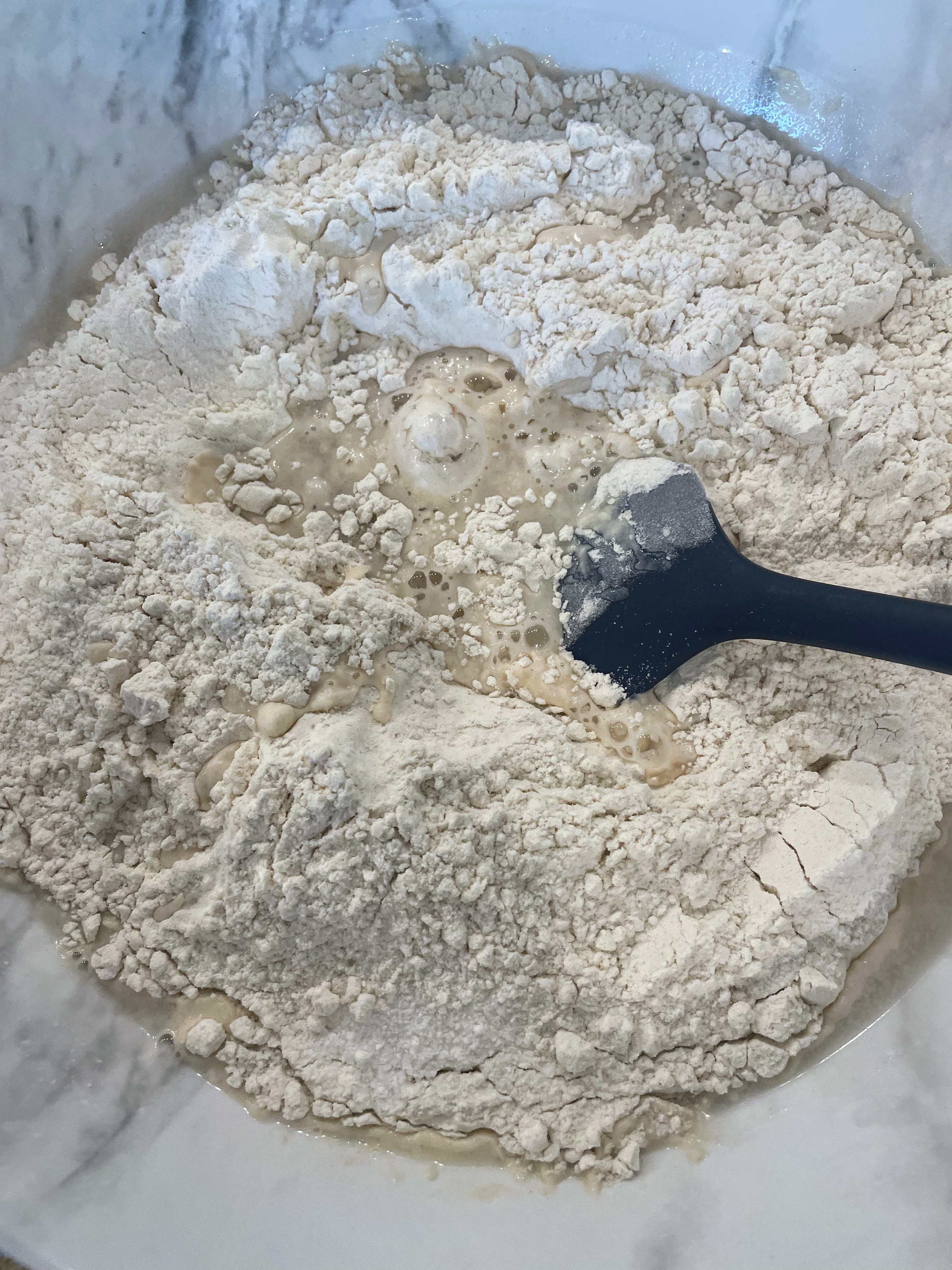 2. Add the all-purpose flour and kosher salt and mix with a rubber spatula until a shaggy dough forms and no dry streaks remain.