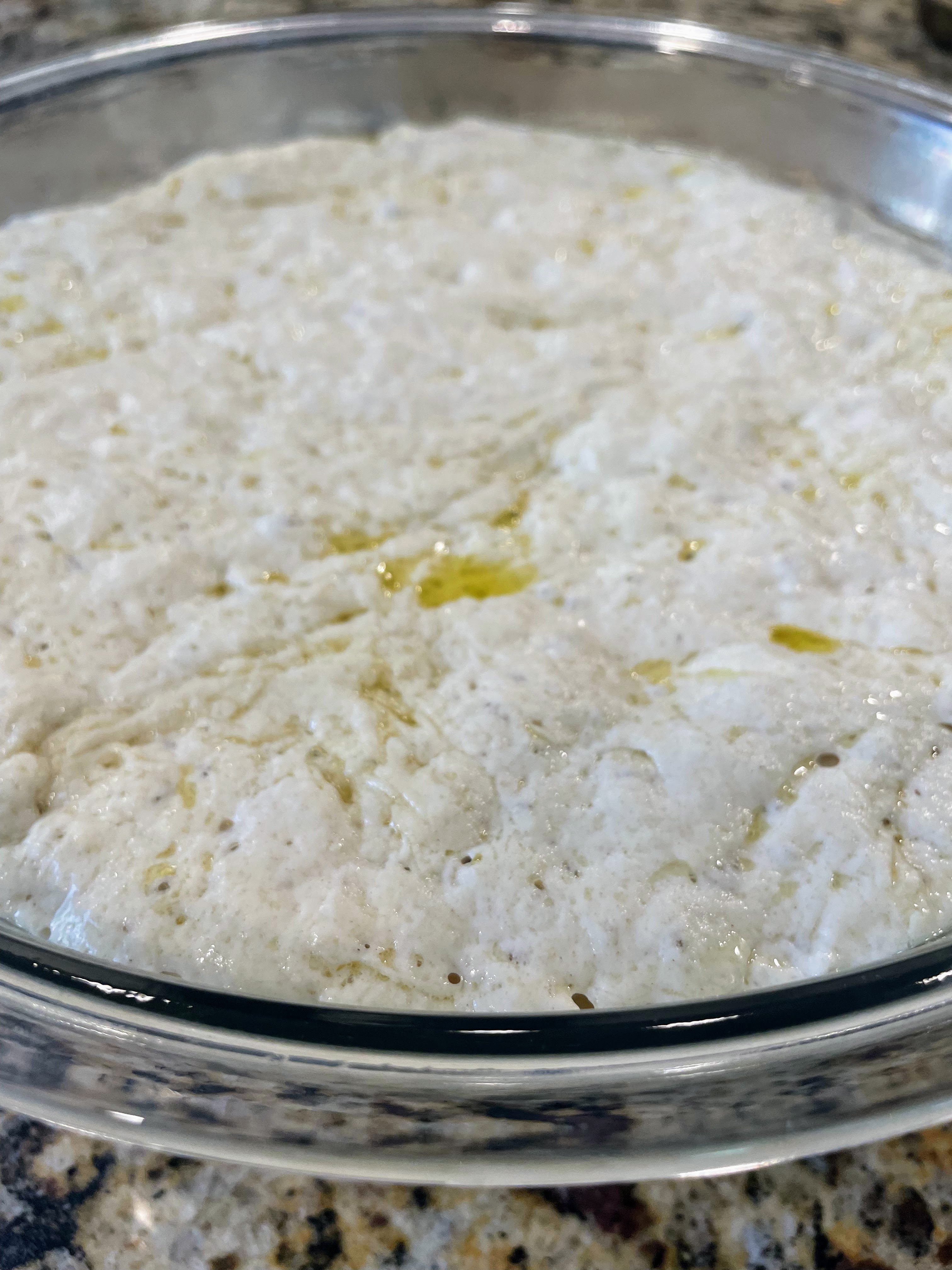 3. Pour 4 tbsp. of the extra-virgin olive oil into a large bowl, as the dough will rise a lot. Transfer the dough to the bowl and turn to coat in oil. Cover with a lid or plastic wrap and let rise at room temperature until doubled in size, 3–4 hours. This is the first rise (quick version).