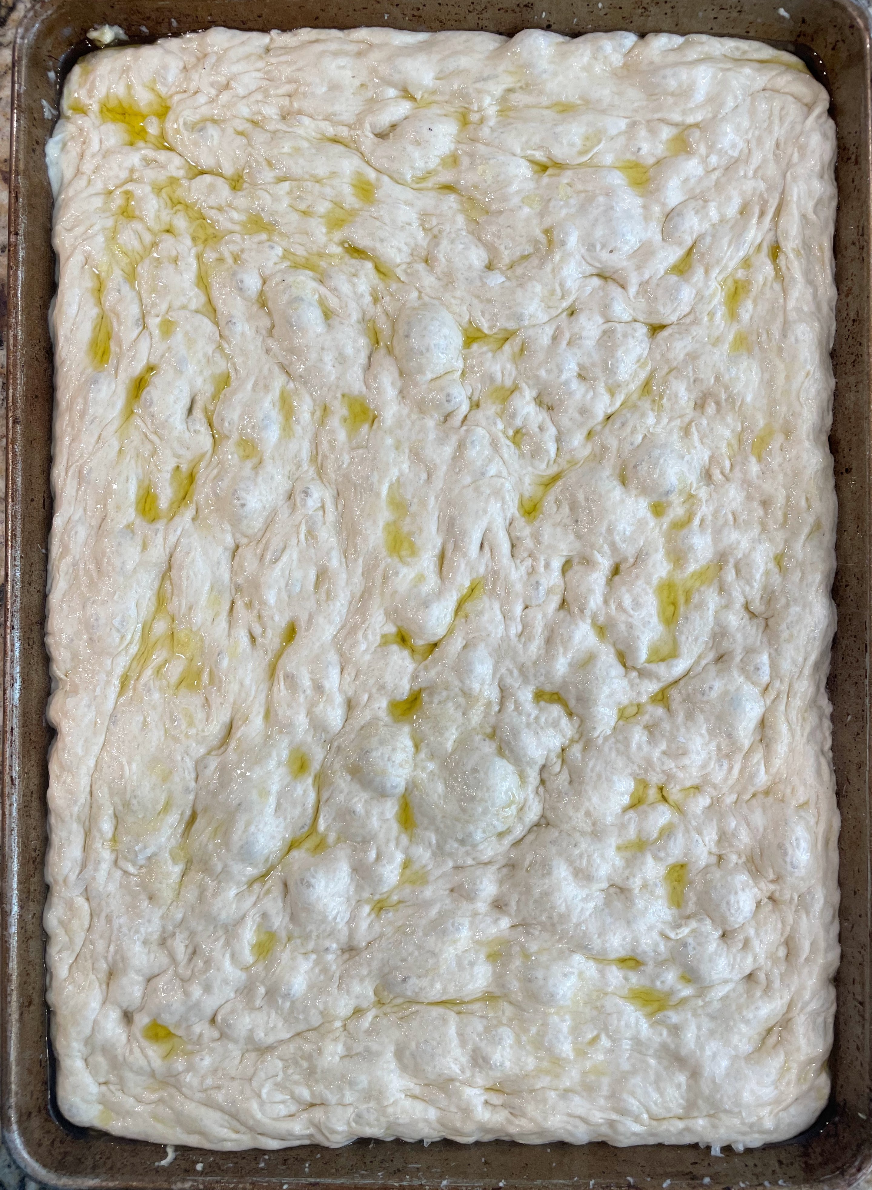 5. Keeping the dough in the bowl and using a fork in each hand, gather up the edges of the dough farthest from you and lift up and over into center of bowl. Give the bowl a quarter turn and repeat the process. Do this two more times until you have made it all the way around the bowl; you want to deflate the dough while slowly forming it into a rough ball. Transfer the dough to the buttered baking sheet. Pour any oil left in the bowl over and turn the dough to coat. Let rise, uncovered, in a warm, dry spot until doubled in size, at least 1½ hours and up to 4 hours. This is the second rise. By the end of it, the dough should have expanded toward the edges of the baking sheet.