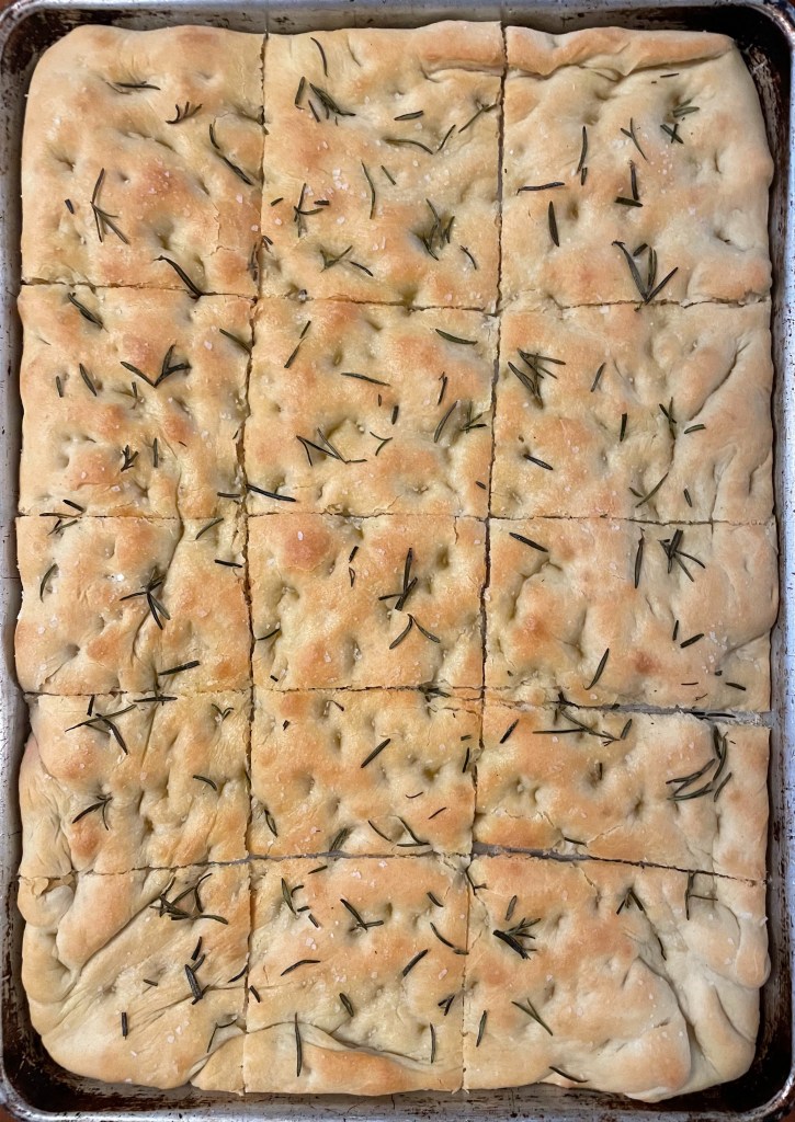 Ingredients: ¼ oz. (7 gr.) active dry yeast 2 tsp. honey 2.5 c. (590 ml.) lukewarm water 22 oz. (625 gr.) all-purpose flour 5.5 tsp. (about 16 gr.) Diamond Crystal kosher salt 6 tbsp. extra-virgin olive oil, divided, plus more for hands butter Maldon sea salt flakes fresh rosemary (optional)