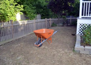 Using the pavers as a guide to depth, we realized we had to dig up 3 inches of the dirt from all over the yard. That task also fell to my husband–who during the next 1.5 weeks dug up and took roughly 5 tons of dirt to the dump–seven trips total. Had we known 3 inches of dirt = 5 tons, we may have thought twice about this whole proposition.