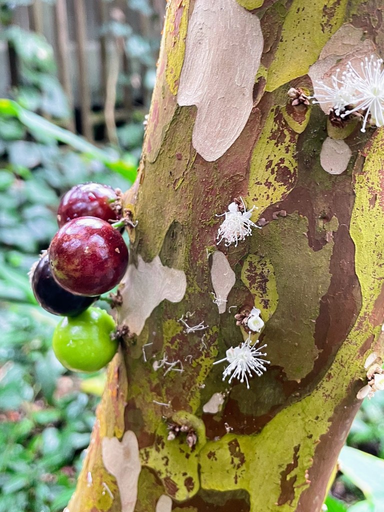 The Jaboticaba (Plinia cauliflora, aka Jaboticabeira, aka Brazilian Grape Tree) is a showstopper because it exhibits an unusual botanical trait, ie, its fragrant white flowers and sweet/tangy fruits grow directly on the trunk of the tree, rather than from new growth or shoots. In botanical terms, this is called cauliflory; hence the “cauliflora” part of the Jaboticaba’s Latin name. (“Plinia” refers to a genus of flowering plants in the myrtle family, Myrtaceae, to which the Jaboticaba belongs.) Other cauliflory plants include Durian, Cacao, Jackfruit, Papaya, and the lesser-known Cannonball Tree — which, though they all share this same botanical trait of cauliflory, are not actually related to the Jaboticaba.