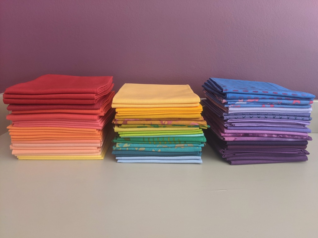 Fabric basics: I knew fabric came in yards, but that was it. (As I mentioned, I had a lot to learn….) Now I know that a bolt of fabric is usually 44″ wide, though width can sometimes vary a tiny bit. So a yard of fabric is usually 36″ x 44″. A half yard is 18″ x 44″ and a fat quarter is 18″ x 22″. I started out by buying inexpensive fat-quarter bundles online, to use for practice: