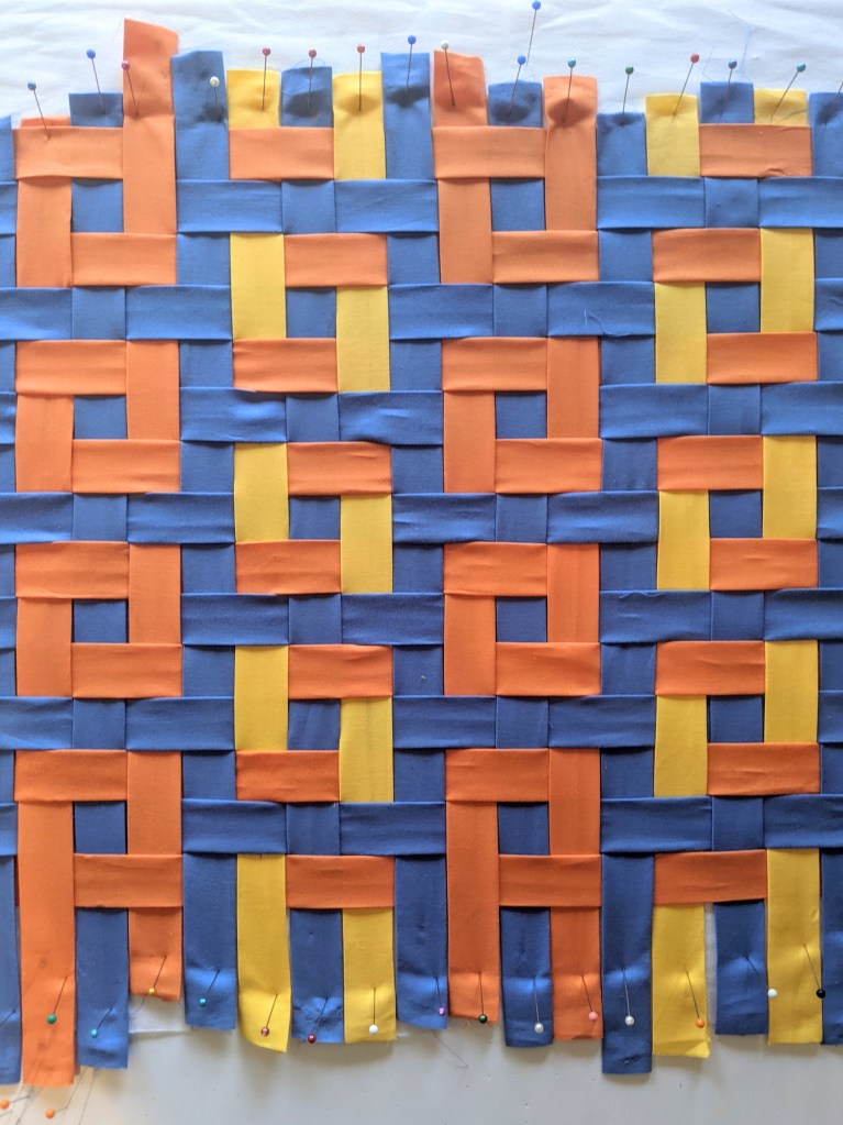 Patterns: There are MANY different ways to weave. I chose three colors (orange, blue, yellow) of inexpensive fat-quarter fabric and decided to try all sorts of patterns with those. But instead of trying the easiest pattern first, I went straight for a triaxial/tumbling block weave, because why not? (There are reasons why not, but I ignored them. I should have remembered that this pattern is also fittingly called a “madweave.”) A triaxial weave has three layers: A first set of strips that are pinned vertically onto the foam board/interfacing (see the blue strips below), a second layer of strips going diagonally upward to the left at a 30-degree angle (see yellow strips below), and a third layer of strips going diagonally upward to the right at a 30-degree angle, moving over and under the previous two layers. For this type of weave especially, a WEFTY tool is essential (I use it for all my weaves; it makes everything much easier). I used a 1″ WEFTY (the larger of the two purple ones below) for the actual weaving, and a smaller one to help lift the strips. [Note: You can see the fusible interfacing below the blue strips; everything rests atop a foam board, too.]