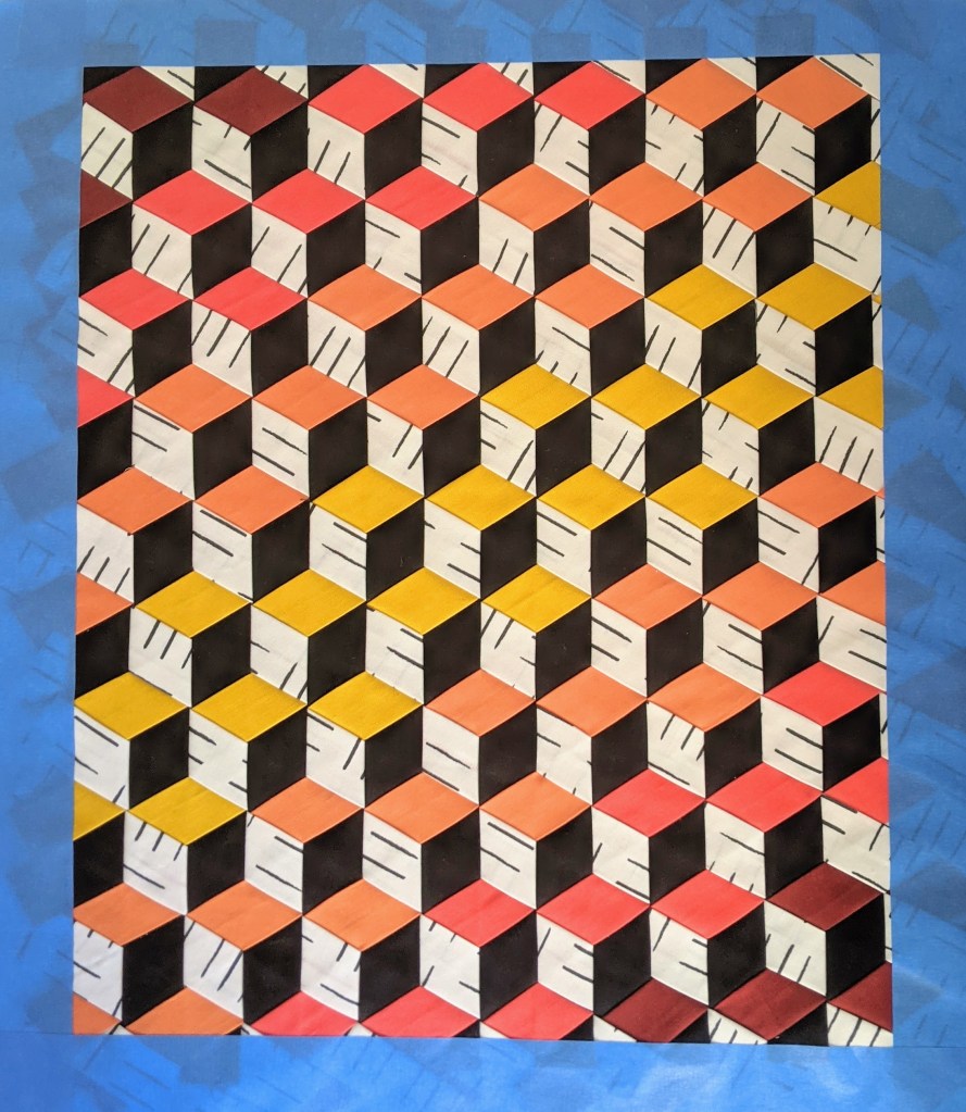 This weave is the same as the first one I wrote about–it’s a triaxial/tumbling block/madweave pattern–but the fabric strips are woven so that the colors/fabric strips come together to look like hexagons. It is a small example of the diverse results you can get, even with the same basic process.