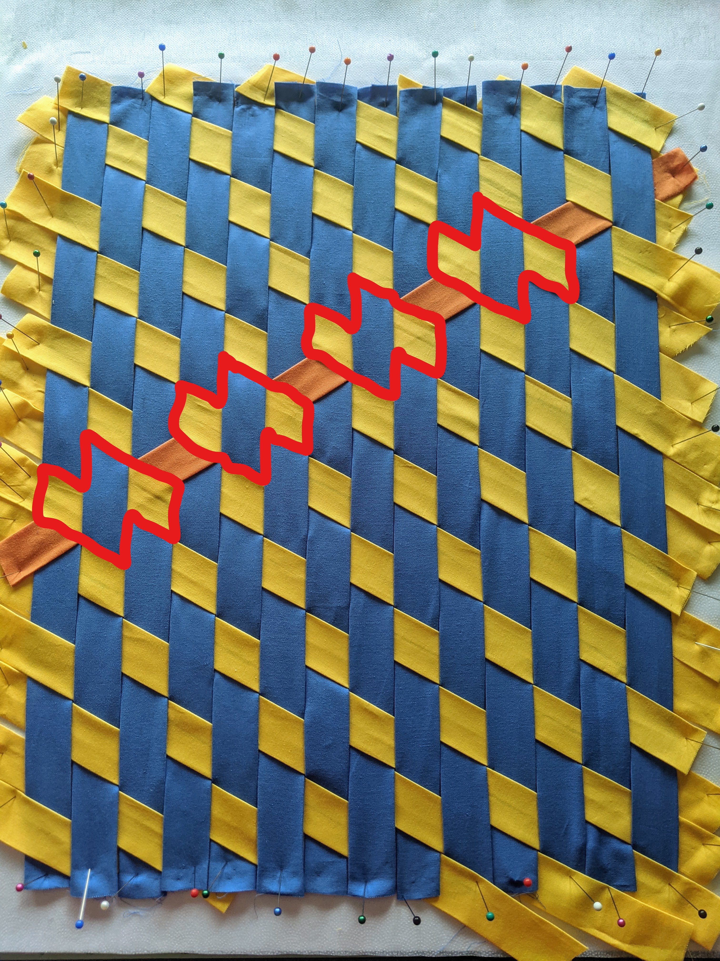 Where to start the third layer: For the third layer, start in middle of the other side (I start this layer on the left side, going up toward the right at a 30-degree angle; see orange strip below). You need to find a guide to know what parts of the first two layers to weave under. Some people look for a bird, others for a backwards “Z,” weaving under the wings and body of each “bird” or the horizontal parts of the “Z” (see red outlines in the photo below; those “birds” or backwards “Zs” are what you will need to weave under in the third layer). Going under the first wing and the body of the “bird” is easy; maneuvering the Wefty tool under the second wing but over another underlying strip of fabric below that wing is more tricky and requires some lifting and checking to make sure you’re getting it through the right way. This is when the second, smaller WEFTY tool helps; you can use it to lift the fabric and guide the main WEFT tool through (you can also use a tool called That Purple Thang for the same purpose). Once you get a sense of how to do it, this layer is actually very straightforward; you weave each strip exactly the same way, no Strip 1, Strip 2, etc. It’s also a fun layer to weave because you’ll start seeing the tumbling block pattern emerge after you’ve woven a few strips.
