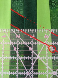 Layer 2: First, find the 30-degree angle. Lay your ruler horizontally across the Layer 1 strips on your board (in the middle of the board, lined up against the right edge) so you can see how the 30-degree angle is situated. Then weave your first Layer 2 strip so that it approximates the 30-degree line, going up toward the left from the middle of the right side. Check the strip against the ruler, to make sure it is at the correct angle, adjusting it as needed until it is perfectly aligned. You may need to tug it gently into place until it is perfect (see the dark green strip below outlined in red).