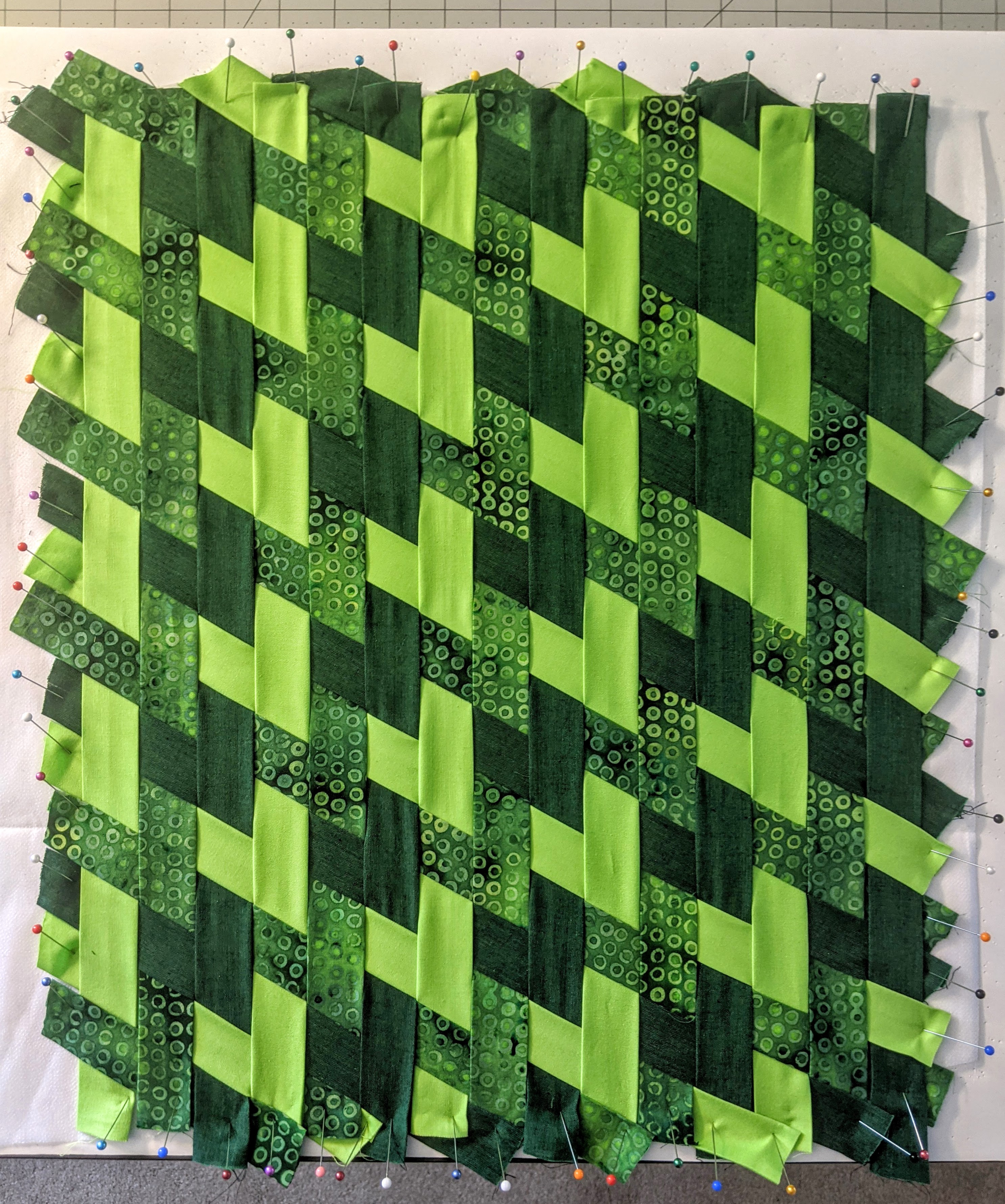 The basic weave for Layer 2 is “over one, under two,” though you will need to stagger that pattern for each row/color. In my case, with 15 strips in Layer 1 and using the dark green fabric as my Strip 1, my pattern was (starting from right side and going up to the left):